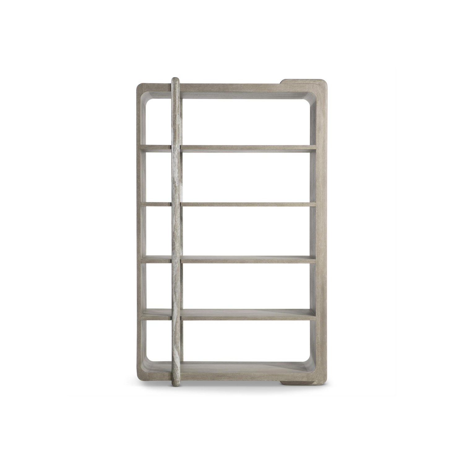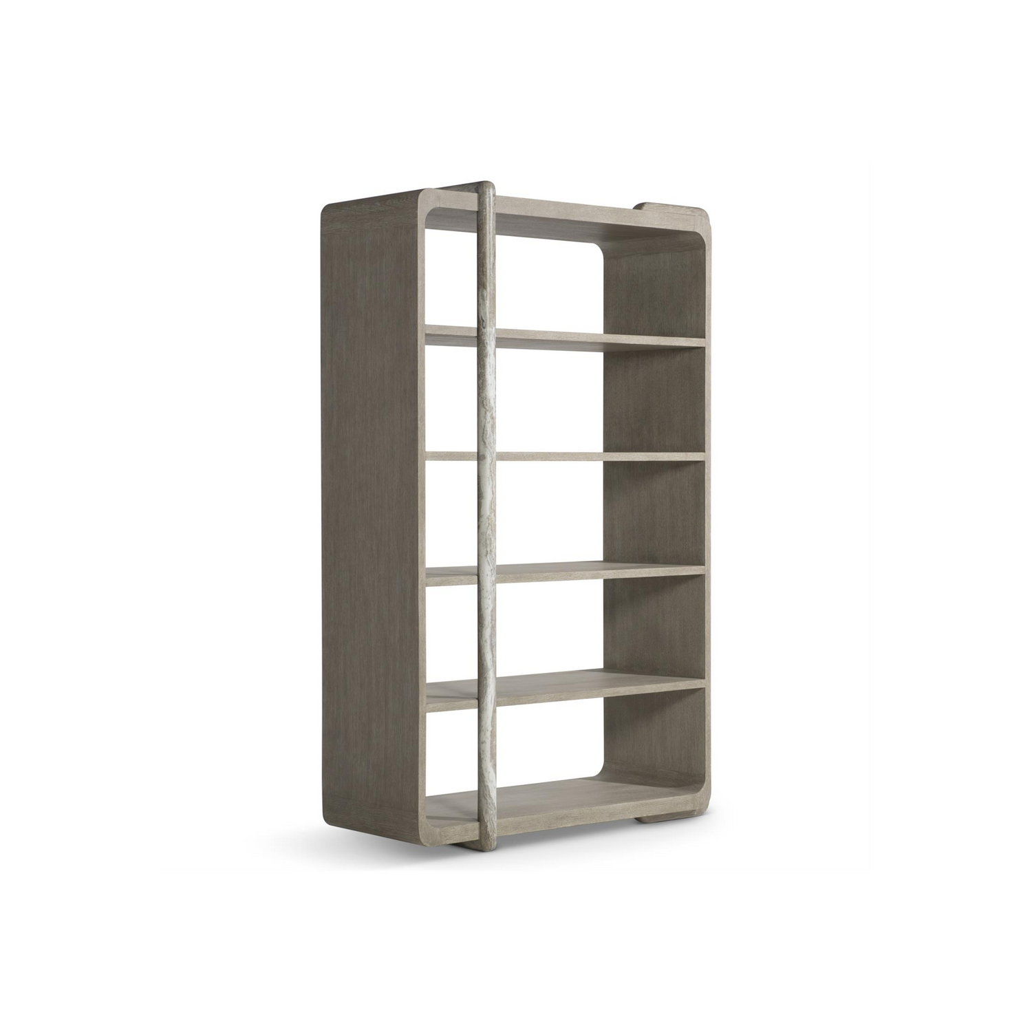 Bold shapes and a mix of materials craft a modern organic style for this etagere.Wrapped shapes and a textural style give the Arcadia etagere a standout design in oak and faux stone. A rounded wood brace in Clay finish curves over one side of the case, while a faux stone post in Kalta encircles the front and back.