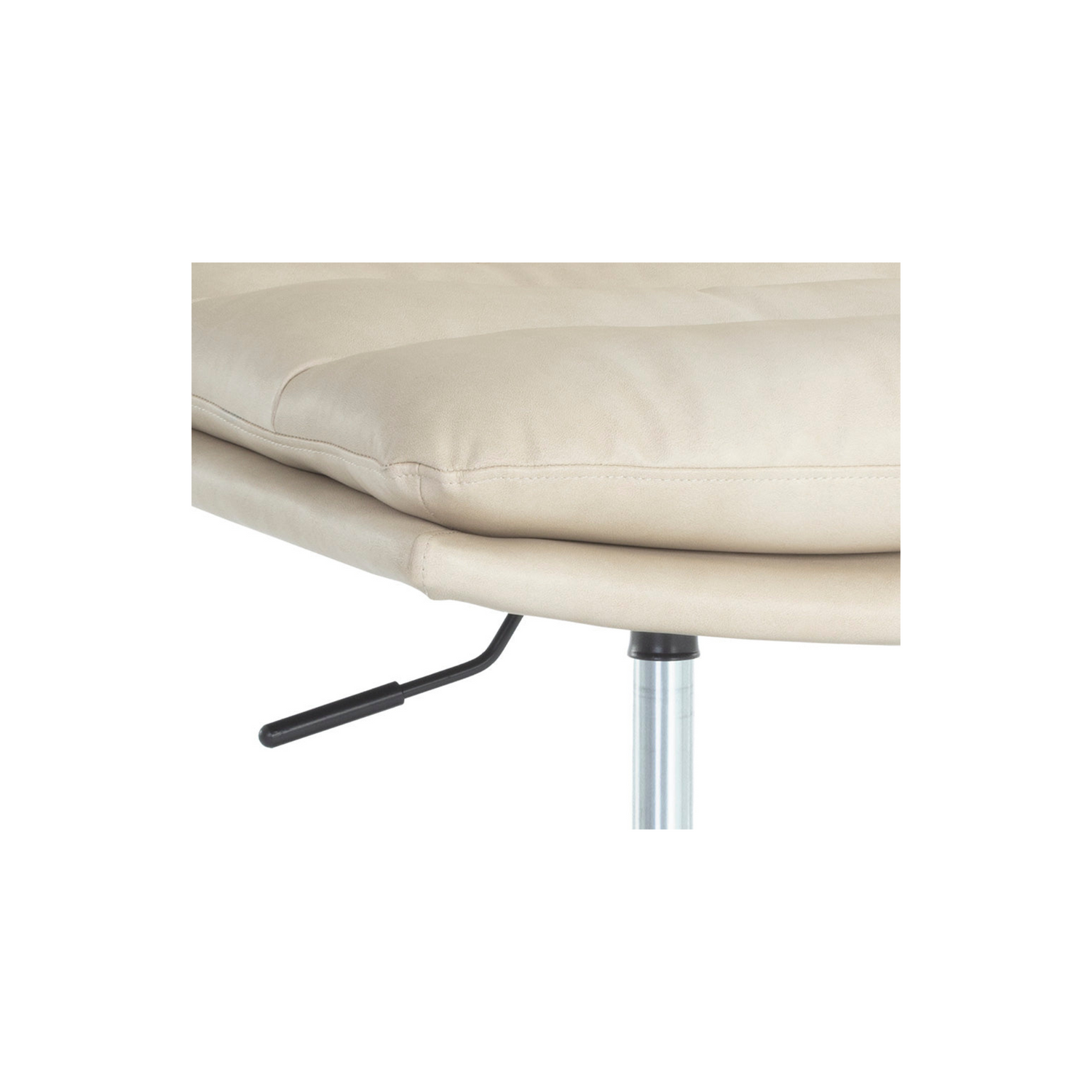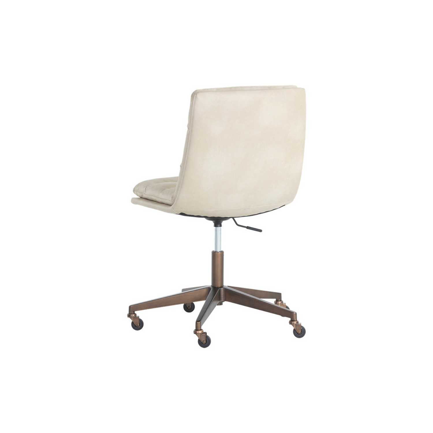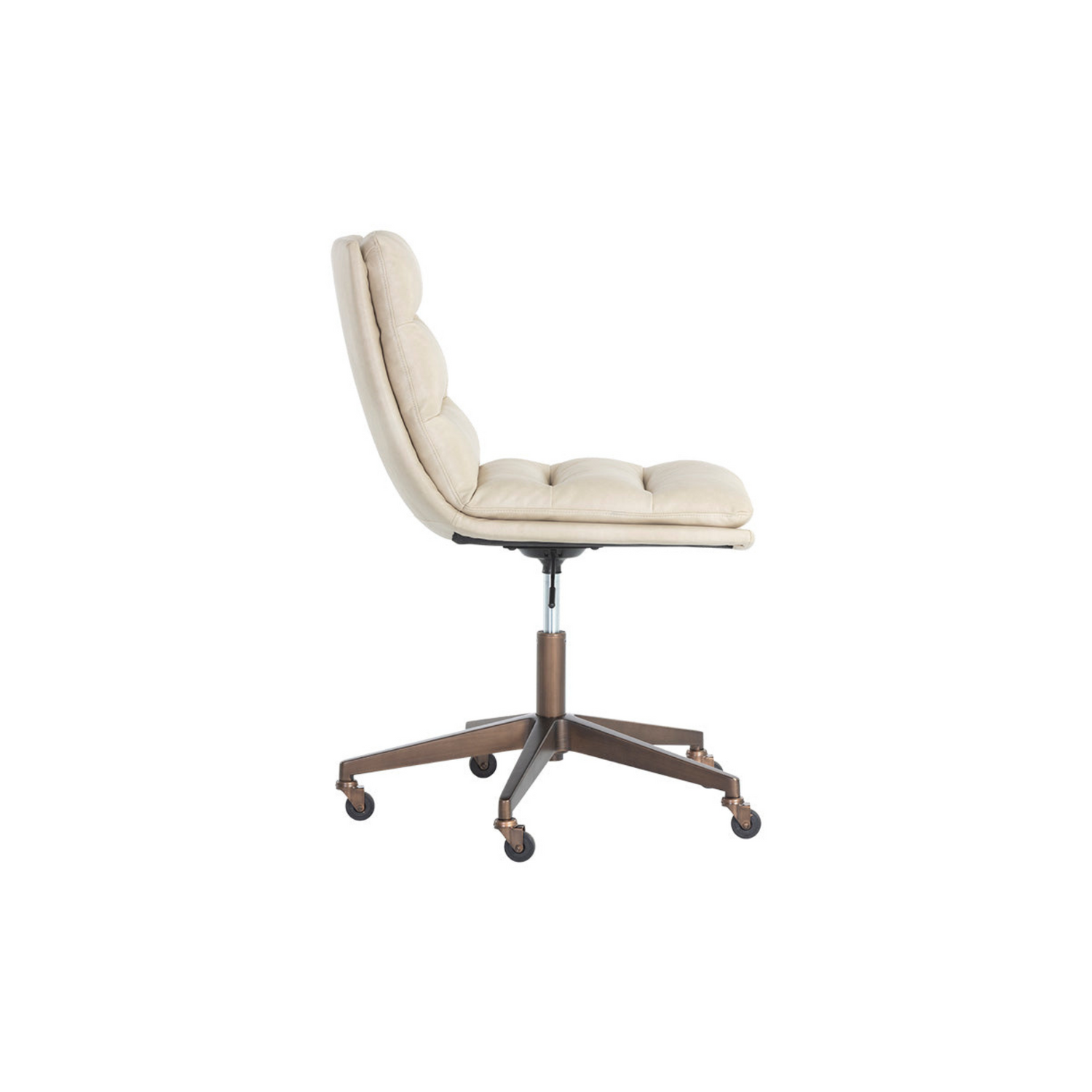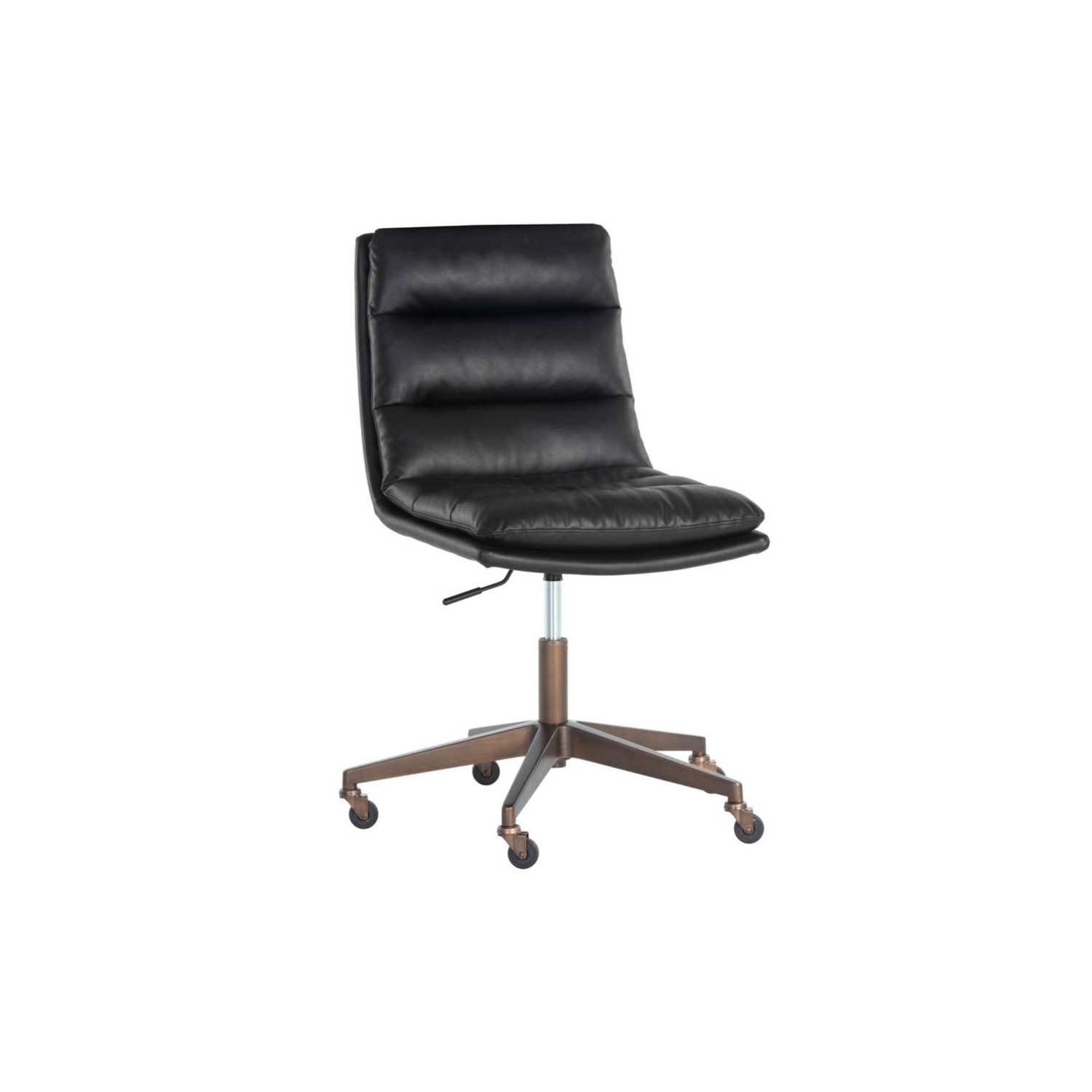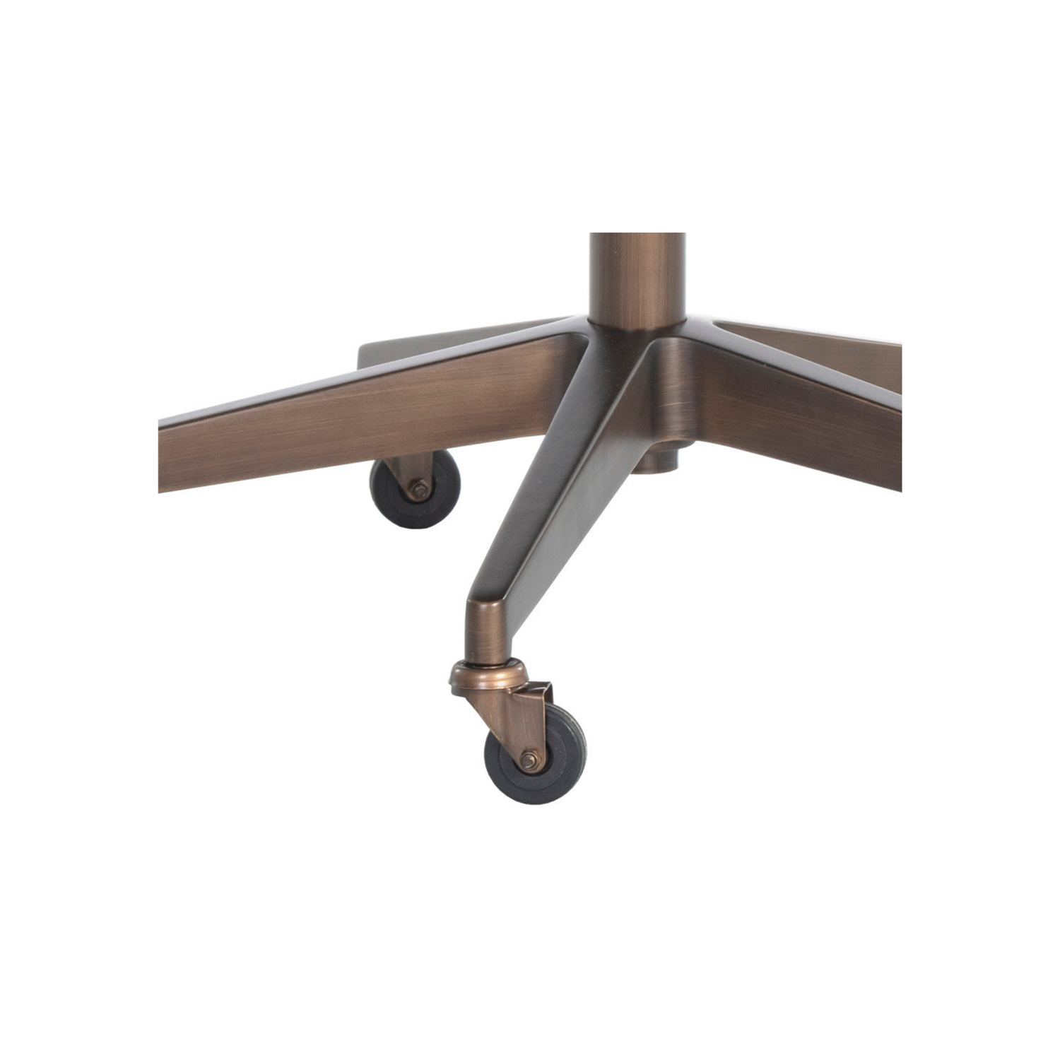 Work in maximum comfort with this mid-century modern office chair that features a generously-padded backrest. Stocked in faux leather. Completed with an antique brass steel base with added castors for mobility.