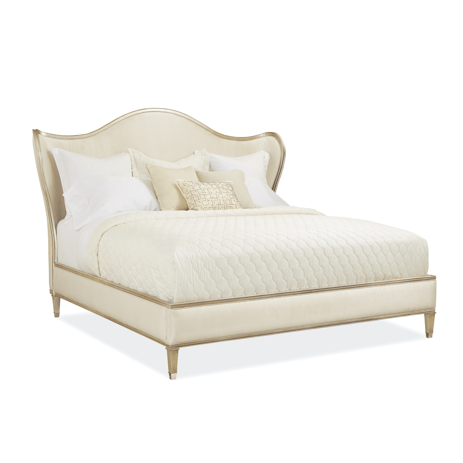 Fall asleep in a dream. The elegantly designed Bedtime Beauty Bed has a swooping camelback, deliciously curved wings, and a glamourous auric silver leaf finish. Available in luxurious cream fabric.