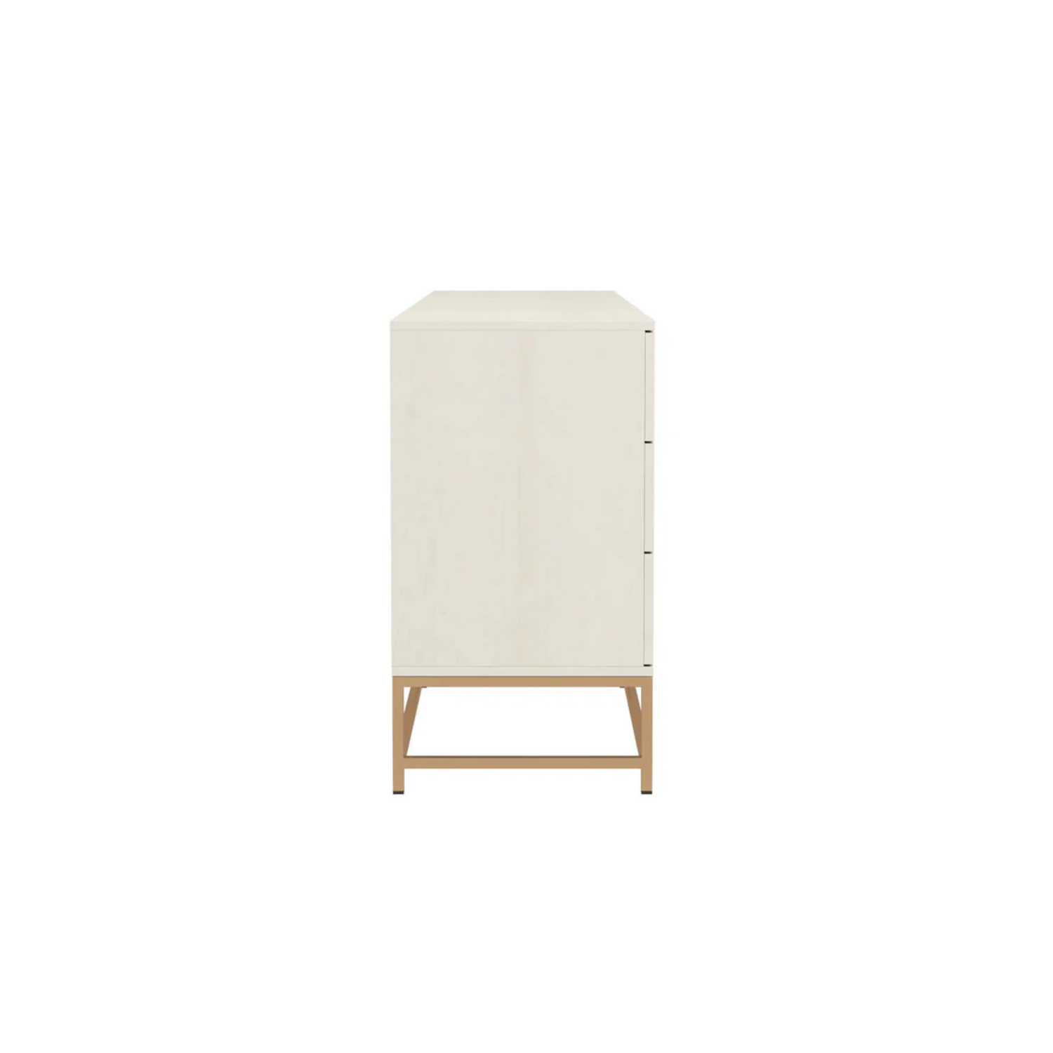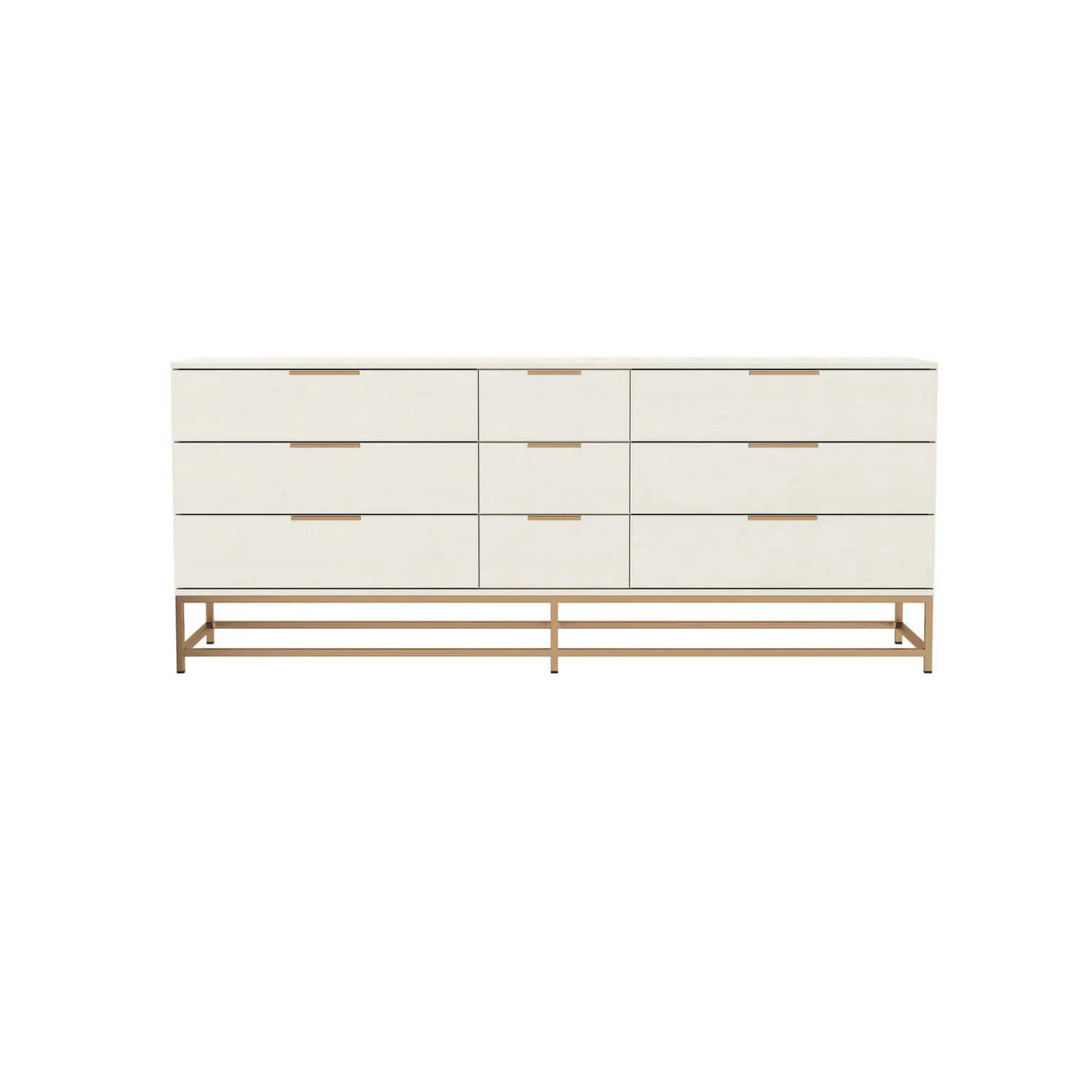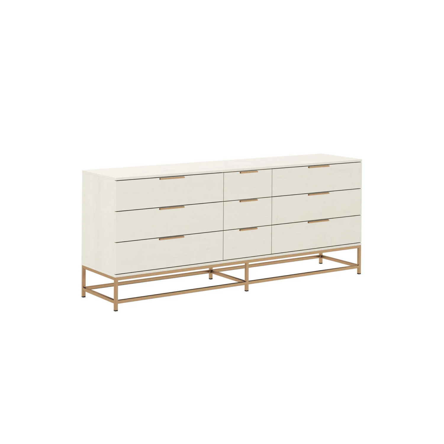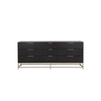 This sleek dresser in charcoal grey oak veneer offers nine soft-closing drawers for ample storage. Finished with brushed gold iron hardware, each piece features unique wood variations, adding character and charm.