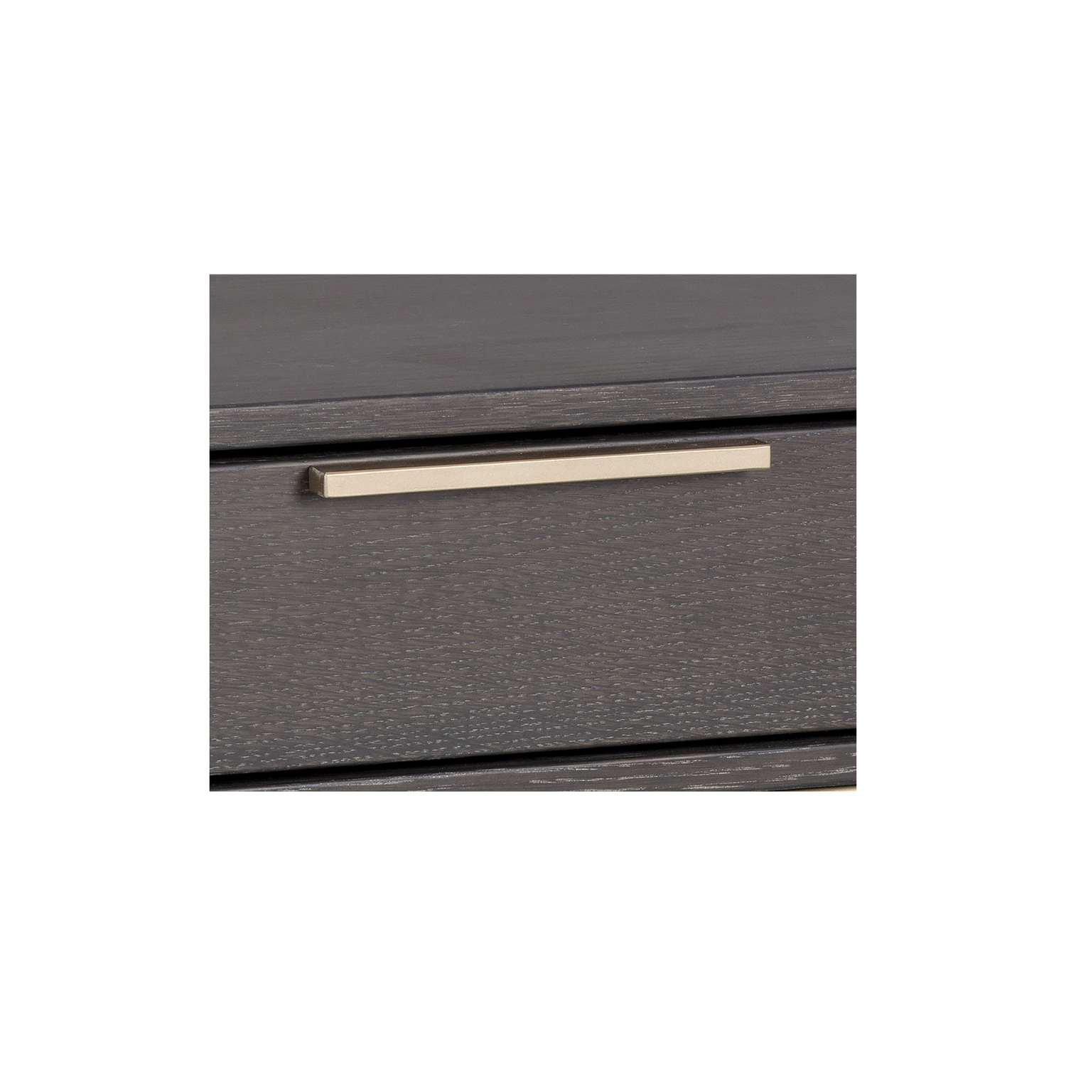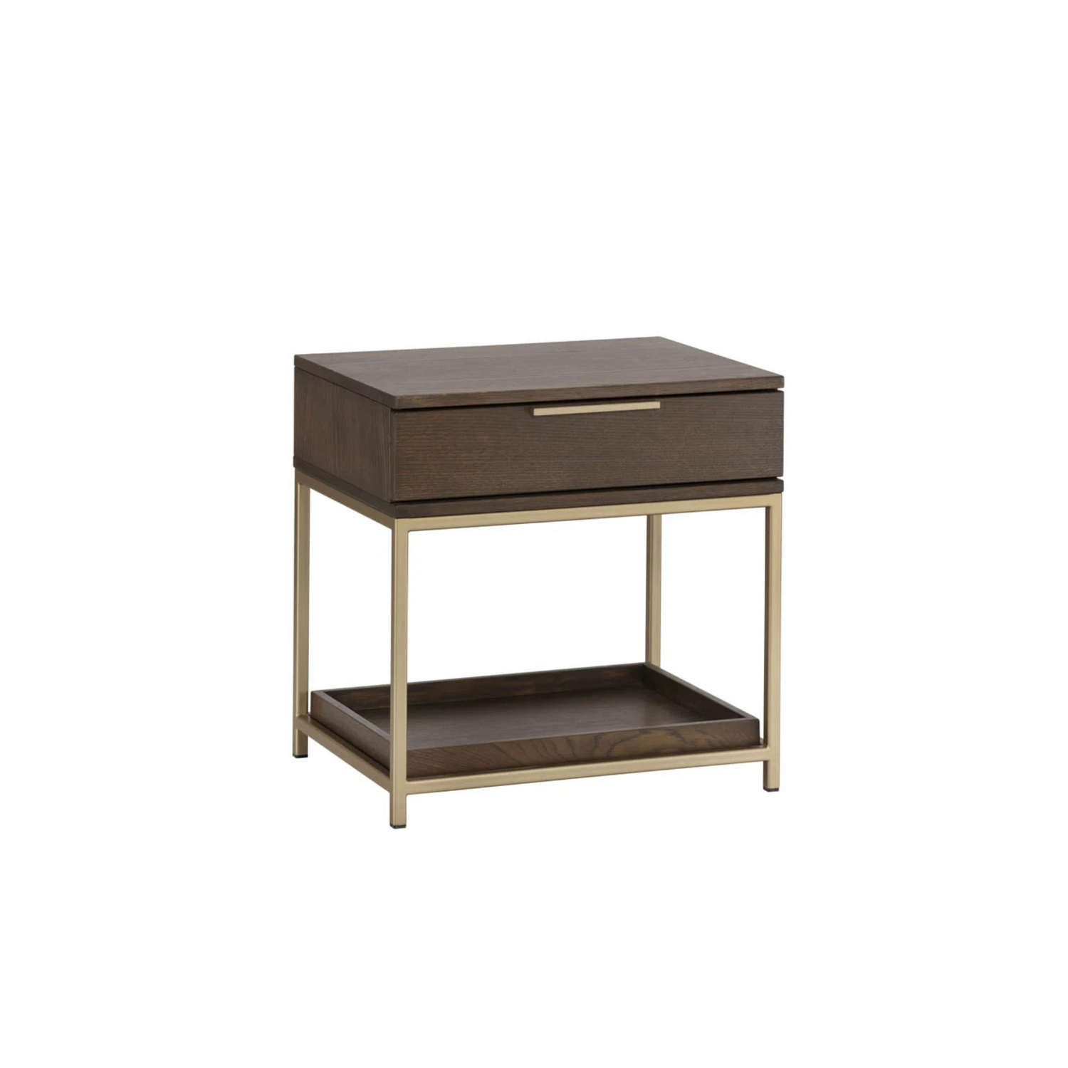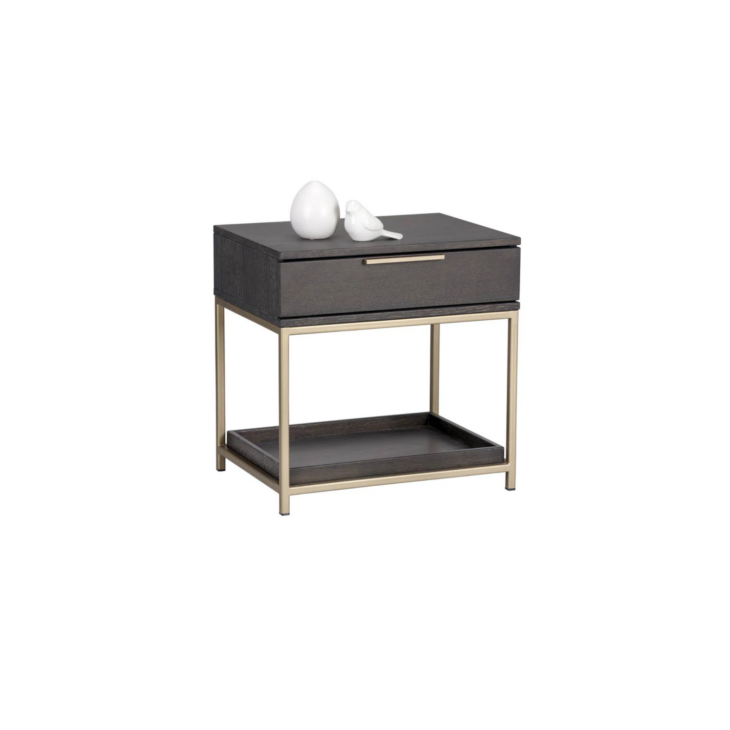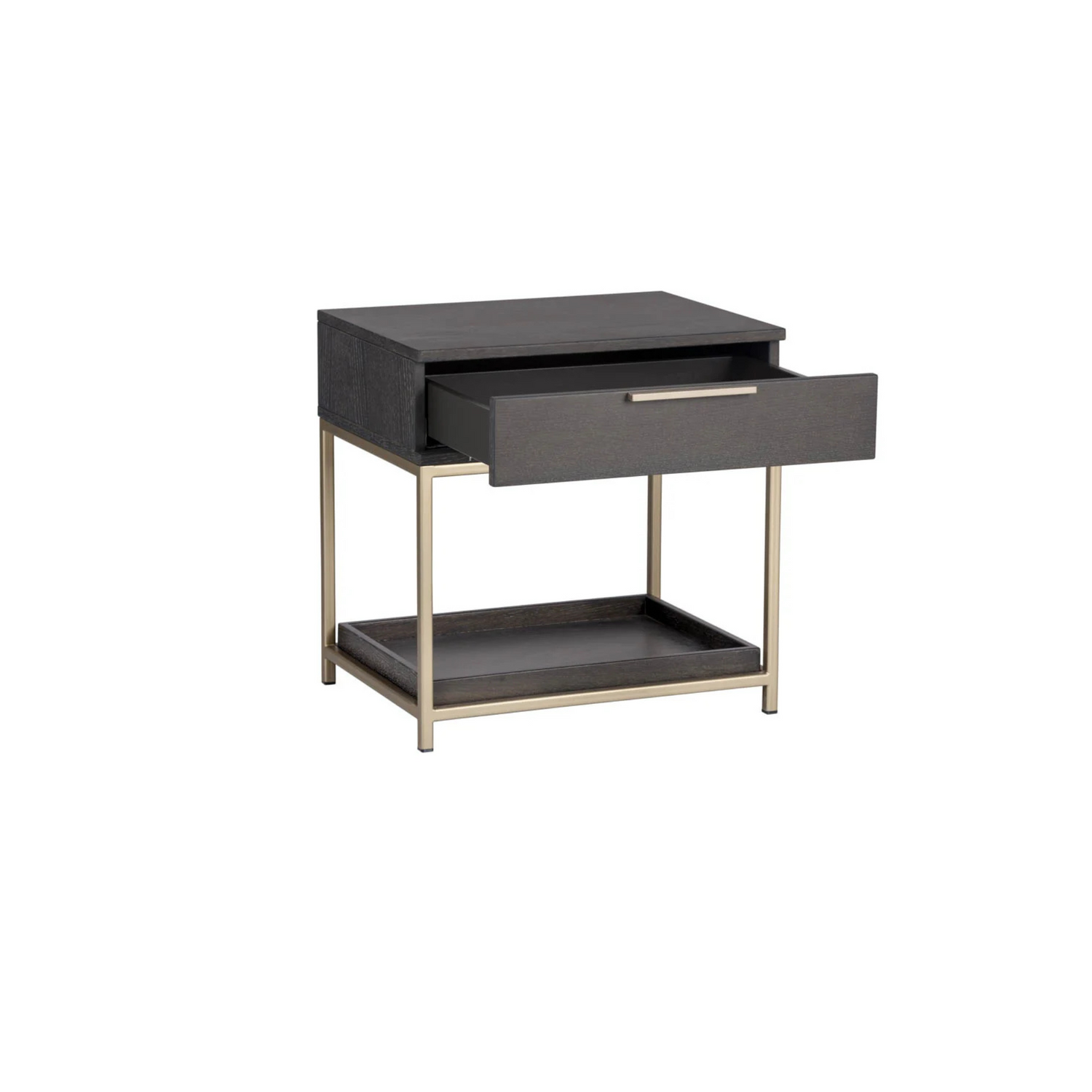A modern nightstand in charcoal grey oak veneer, featuring a soft-close drawer, shelf for extra storage, and brushed gold iron hardware. Natural wood variations, including texture, color, and grain differences, along with knots and cracks, enhance its unique character.