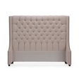 Have a luxurious night in the Sabrina Bed. The diamond-tufted headboard with decorative nail studs and upholstered base equals to a dreamy bed and espresso wood finish. Bed slats included. Made in Canada.