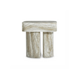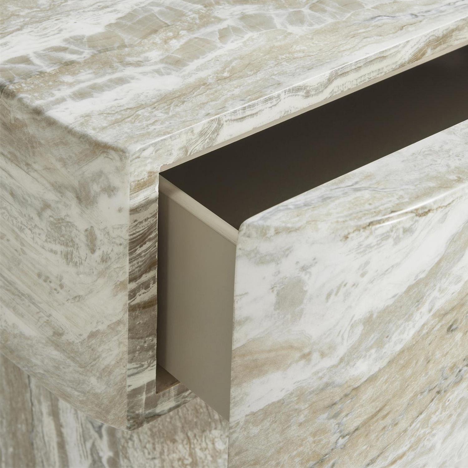 Totemic shapes support the top of the Arcadia nightstand for a beautiful modern, primitive look. Faux stone offers lovely striations in the Kalta finish. The case includes one soft-close drawer with a finger pull.
