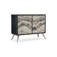 With stunning geode-patterned reverse painted glass doors in a black and ivory pattern, accented by silver metal legs, the Rockee Two-Door Chest takes organic style to the next level. Behind each of the two doors is an adjustable shelf. Crafted of Oak Veneers with Glass and Stainless Steel, the chest has a ventilated back panel.