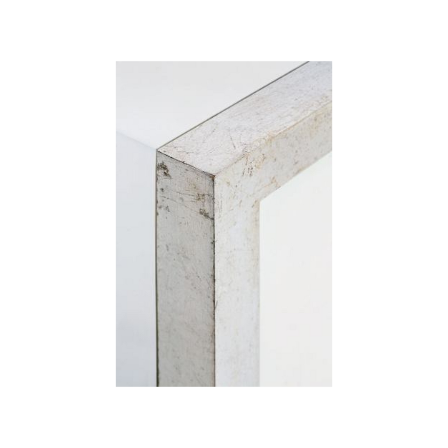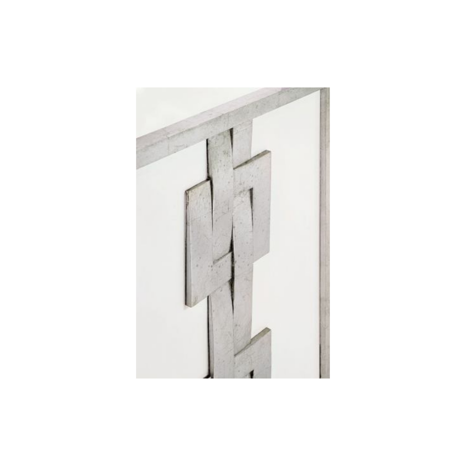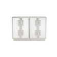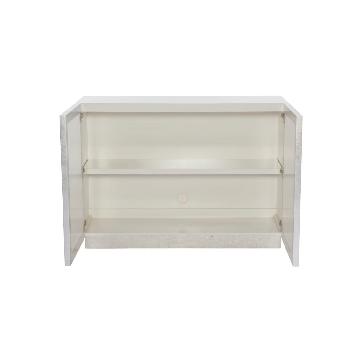 Rectangular door chest. White Lacquer case. Silver Leaf on frame and base, and on cast resin link design overlay on doors. Concealed soft-closing hinges on doors. Behind two doors is one adjustable/removable shelf and back panel with covered grommet (white) for wire management.
