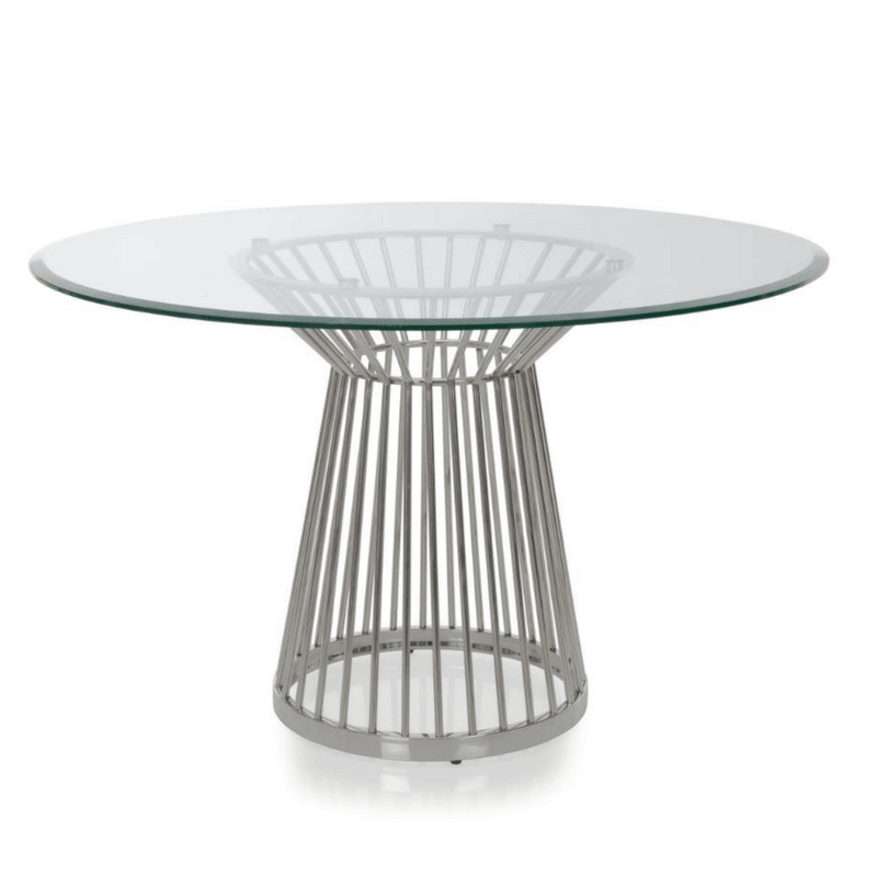 The round metal and glass Atlantis Dining Table features a modern stainless steel base in polished chrome and beveled tempered glass.