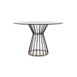 Our Caputo dining table features a trendy smoked glass top and matte black base with gold accents.