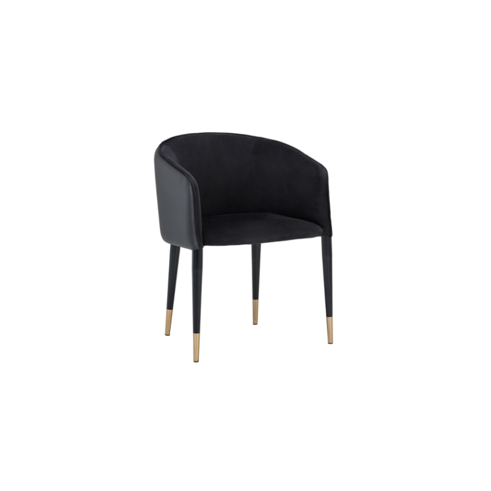 Striking from every angle. A modern barrel back dining armchair upholstered in Abbington black fabric and contrasting Napa black faux leather. Finished with black steel legs and brushed gold foot caps. Abbington black fabric & Nappa black faux leather.
