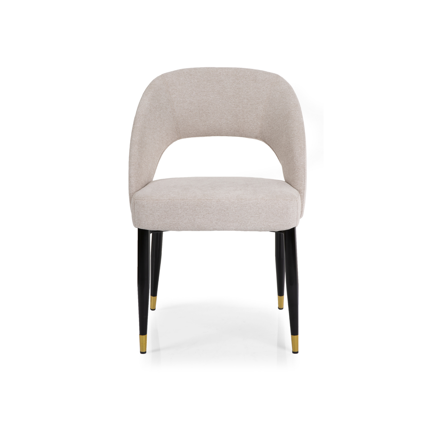 Our Madam chair is space saving and chic! This dining chair has an open back, is upholstered in an ivory synthetic blend fabric and has matte black metal legs with brass caps. Pair with our Contempo dining table for a cool contemporary look.