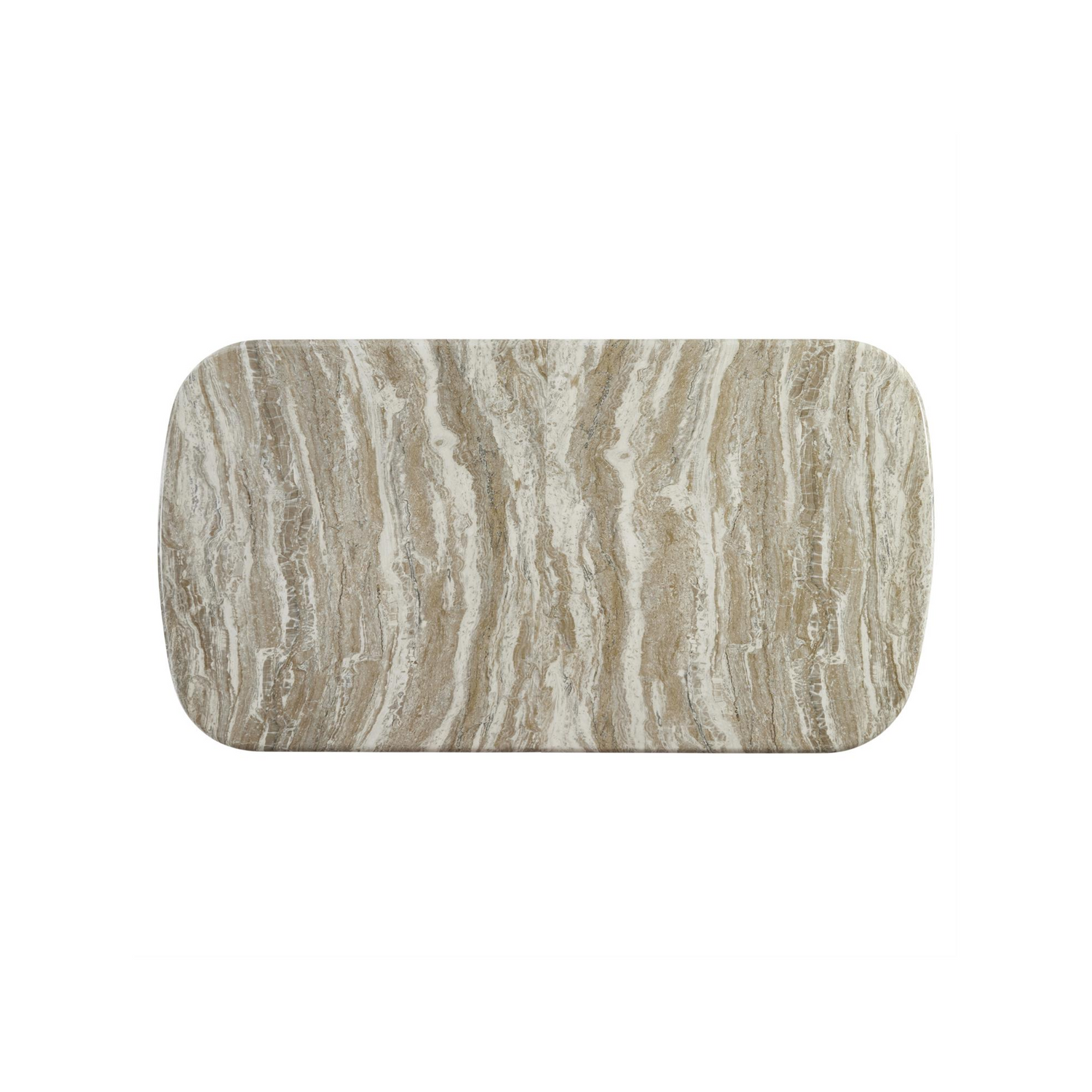 Faux stone top in Kalta finish, supported by four uniquely positioned cast resin legs with woodgrain texture in Clay finish