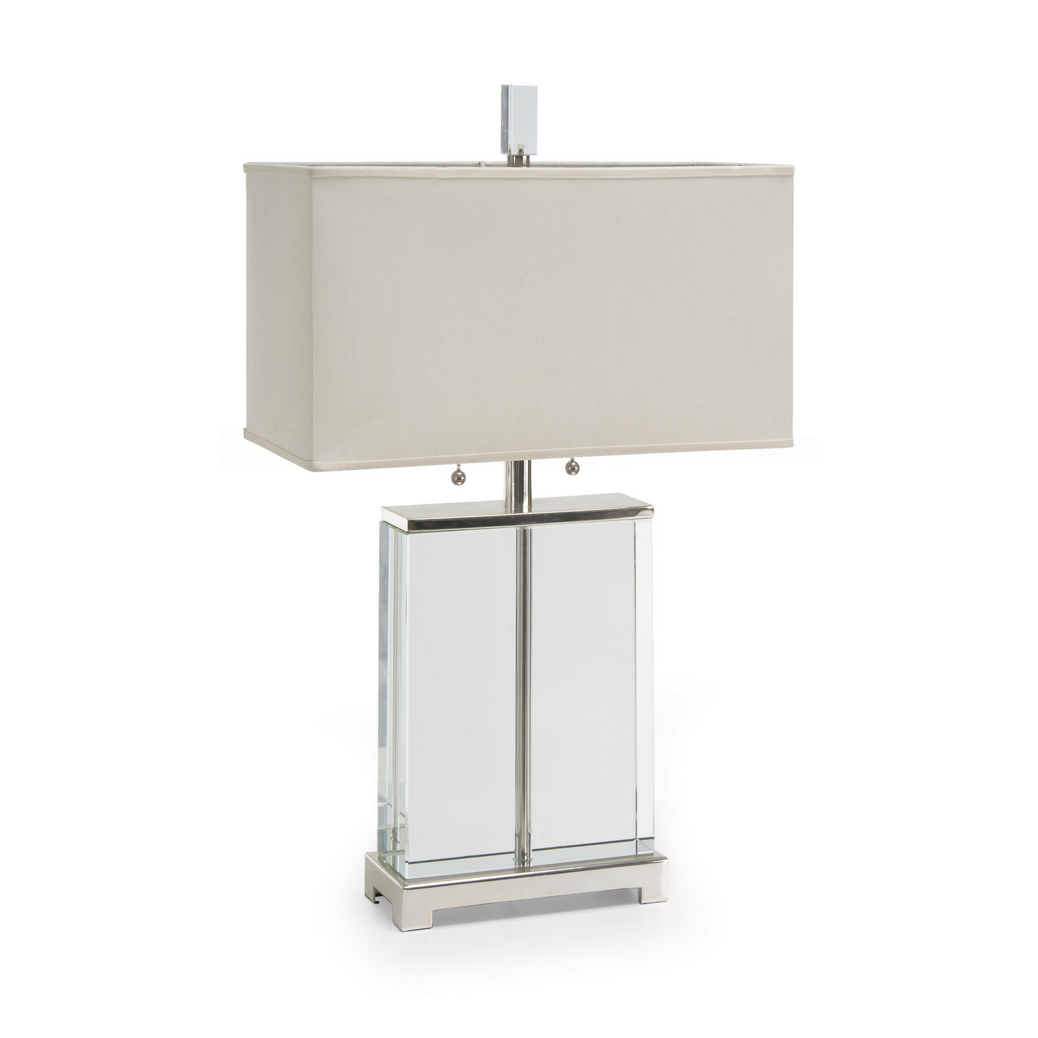 Stylish simplicity. Clean lines define the Kayden Lamp. Large block of crystal, boxy ivory drum shade.