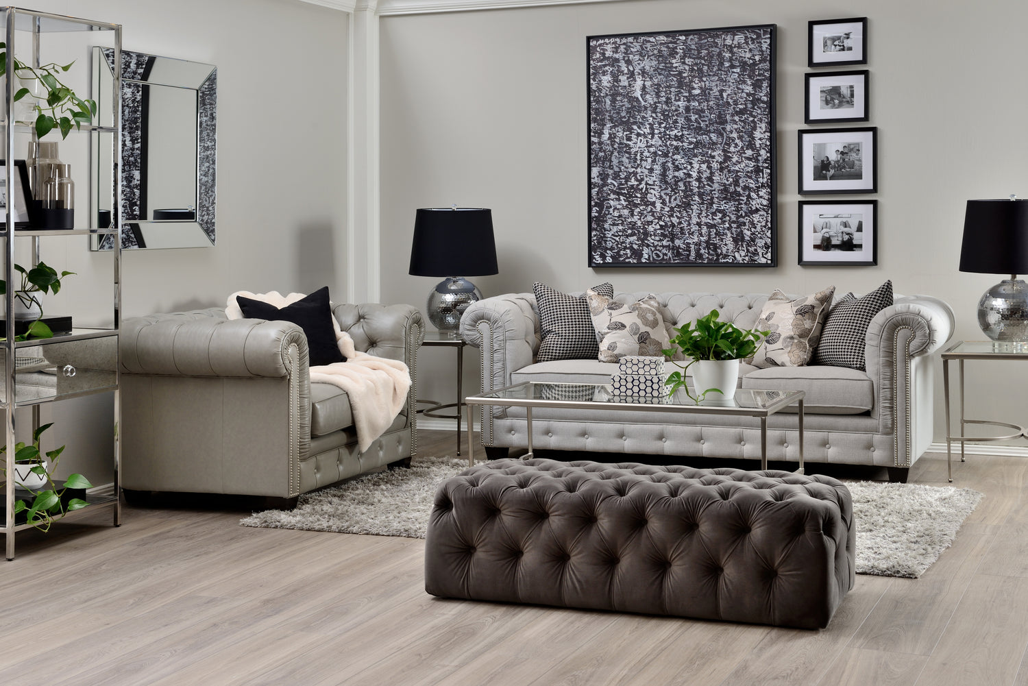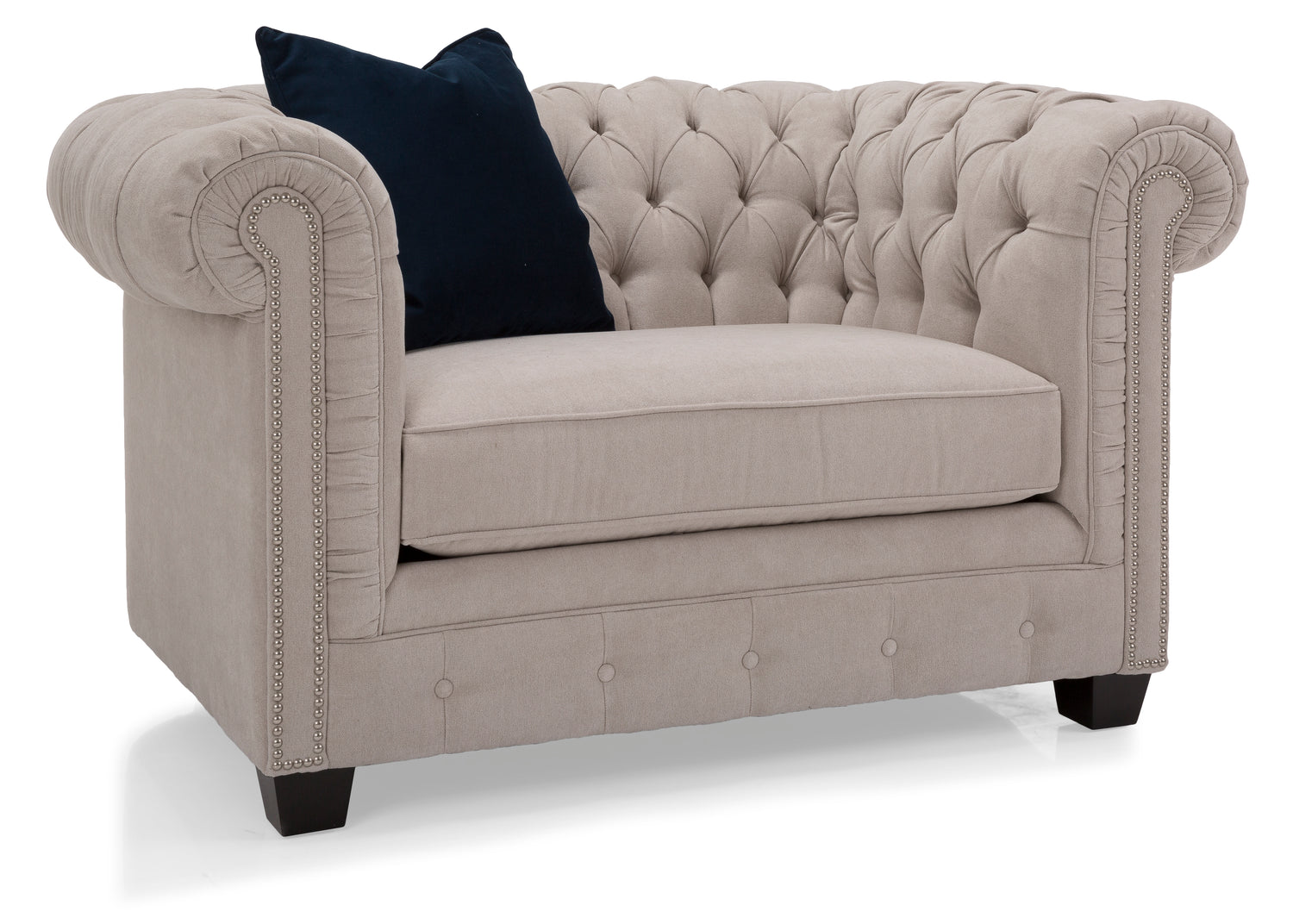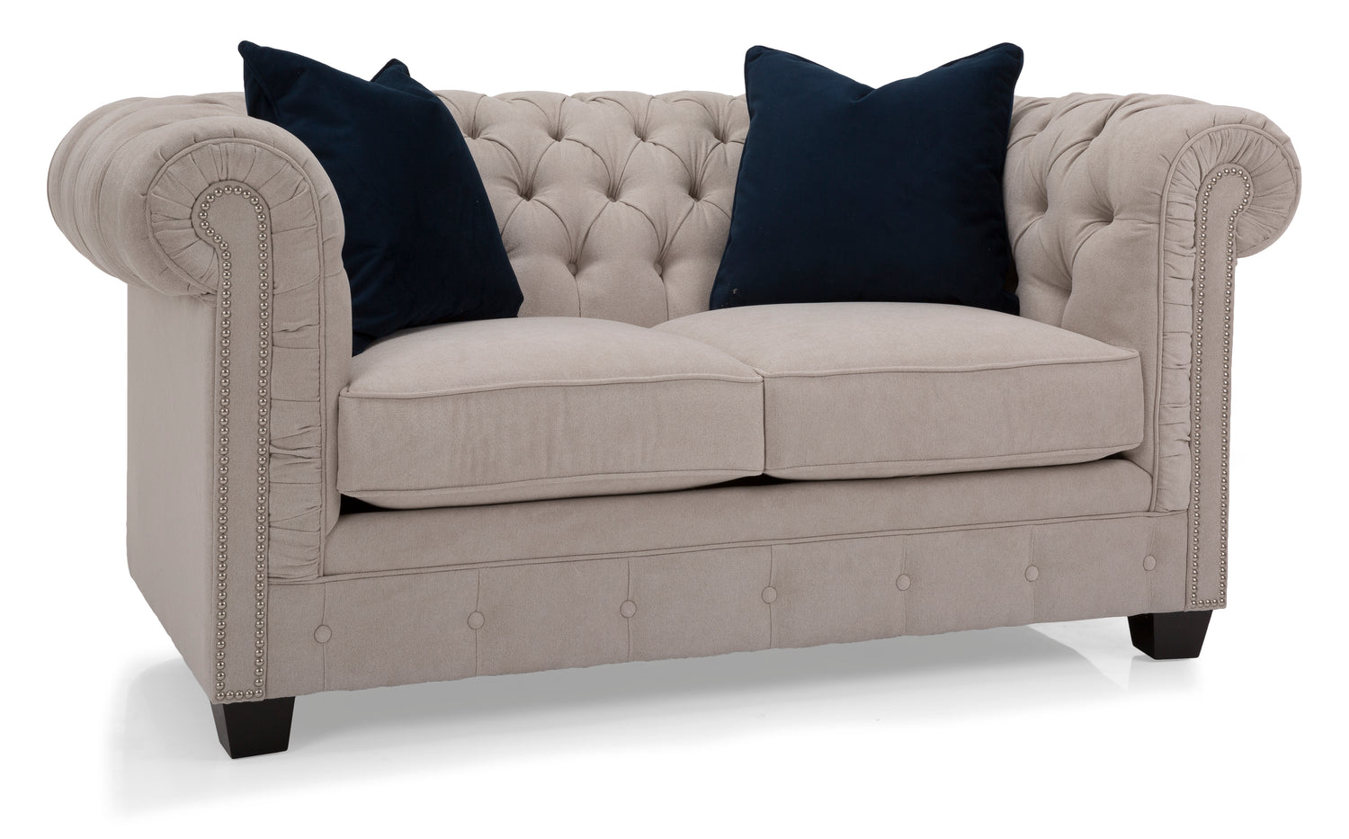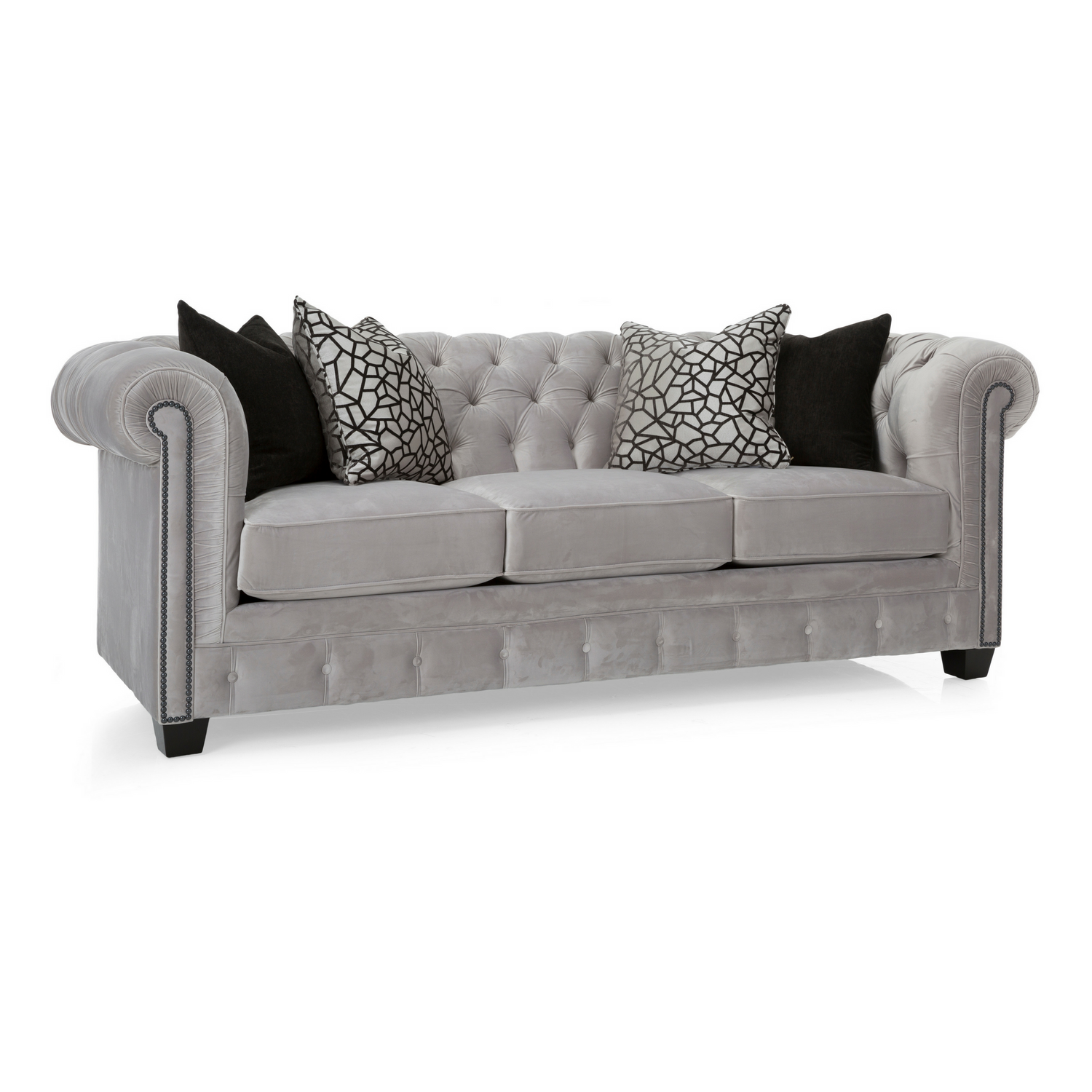 Filled with details, the handsomely designed Charles Sofa comes with a button tufted back , box seating with self-welt, a traditional curved arm with decorative nail studs and espresso wood finish. Available in different fabrics, leathers and finishes. Also available as a loveseat or a chair and a half. Made in Canada.