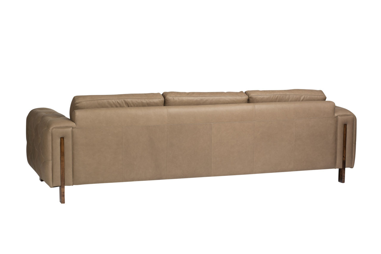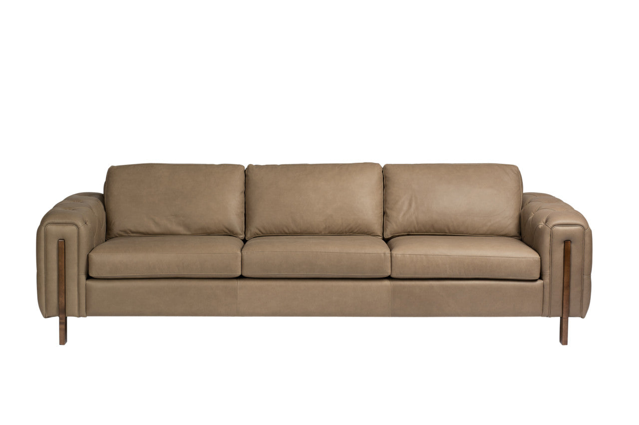 Made for entertaining. Invite your friends to hang out on the Monroe Sofa with its tufted arms, loose back, box seat cushions, and solid wood frame in walnut finish as shown. This sofa will up the lux factor of any space. Stunning details set this sofa collection apart.
