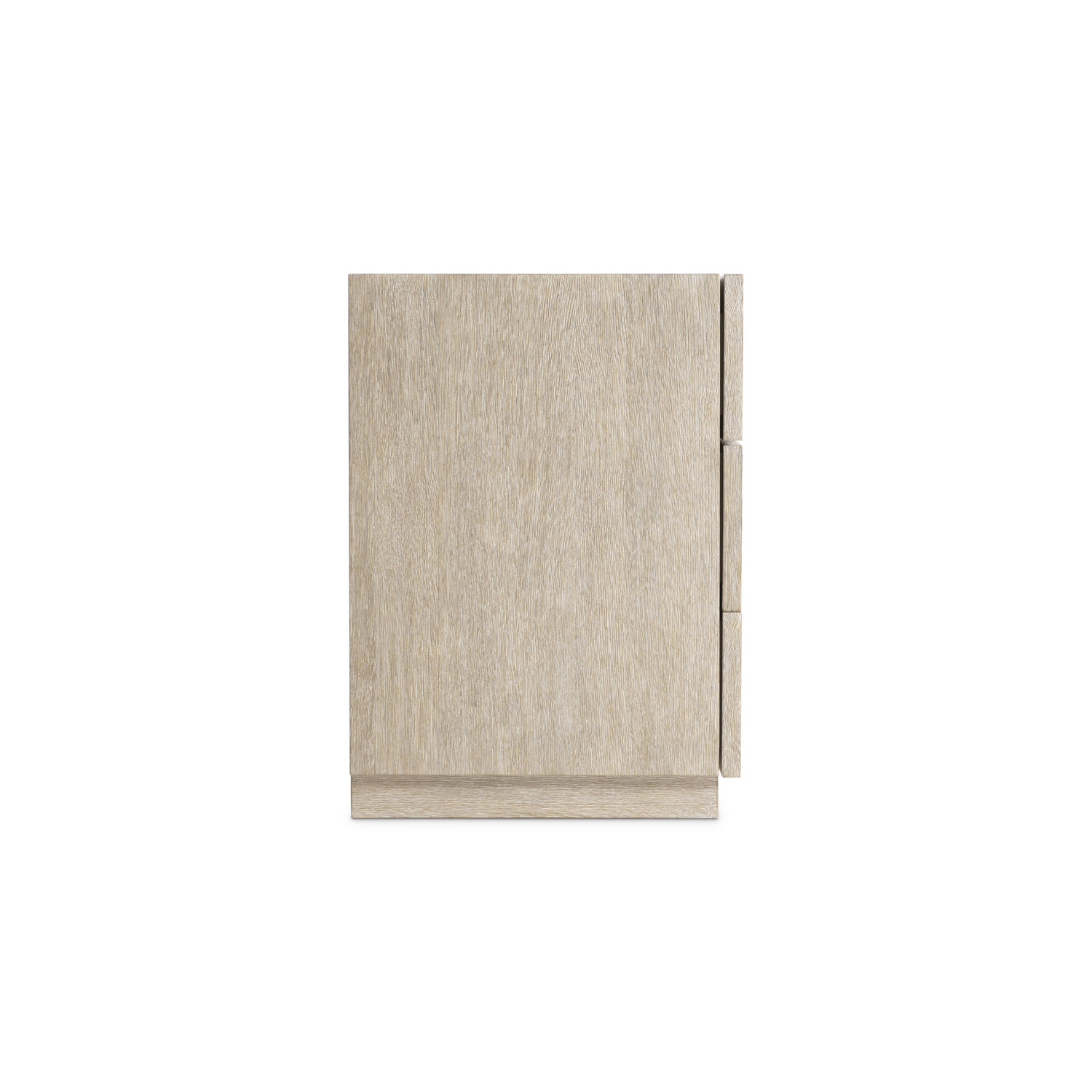 Hammered cast aluminum defines a new modern primitive design for the drawer fronts on the Hansby nightstand. The textural look is balanced by a light wood Trevin finish on the case and plinth base. A two-port A+C USB charging unit provides a high-tech element.