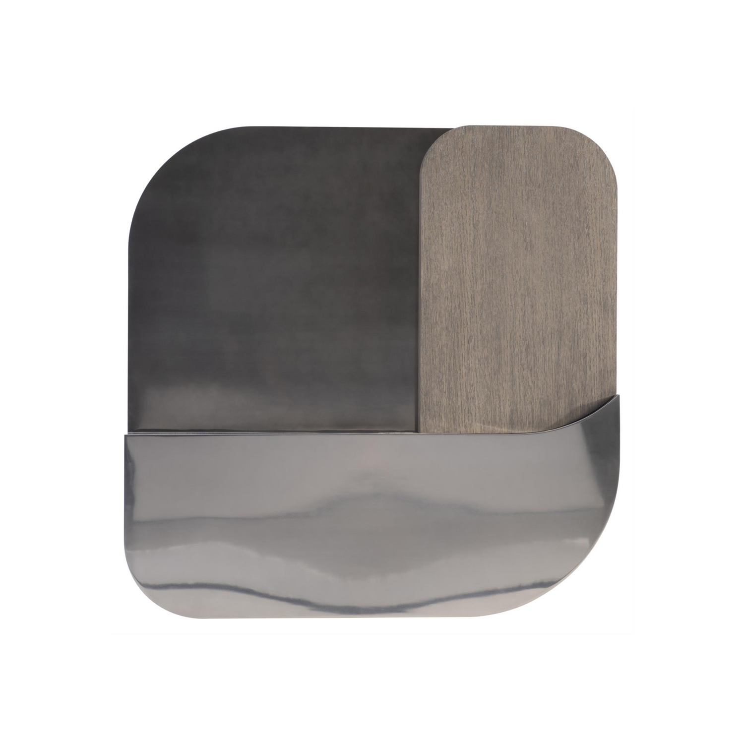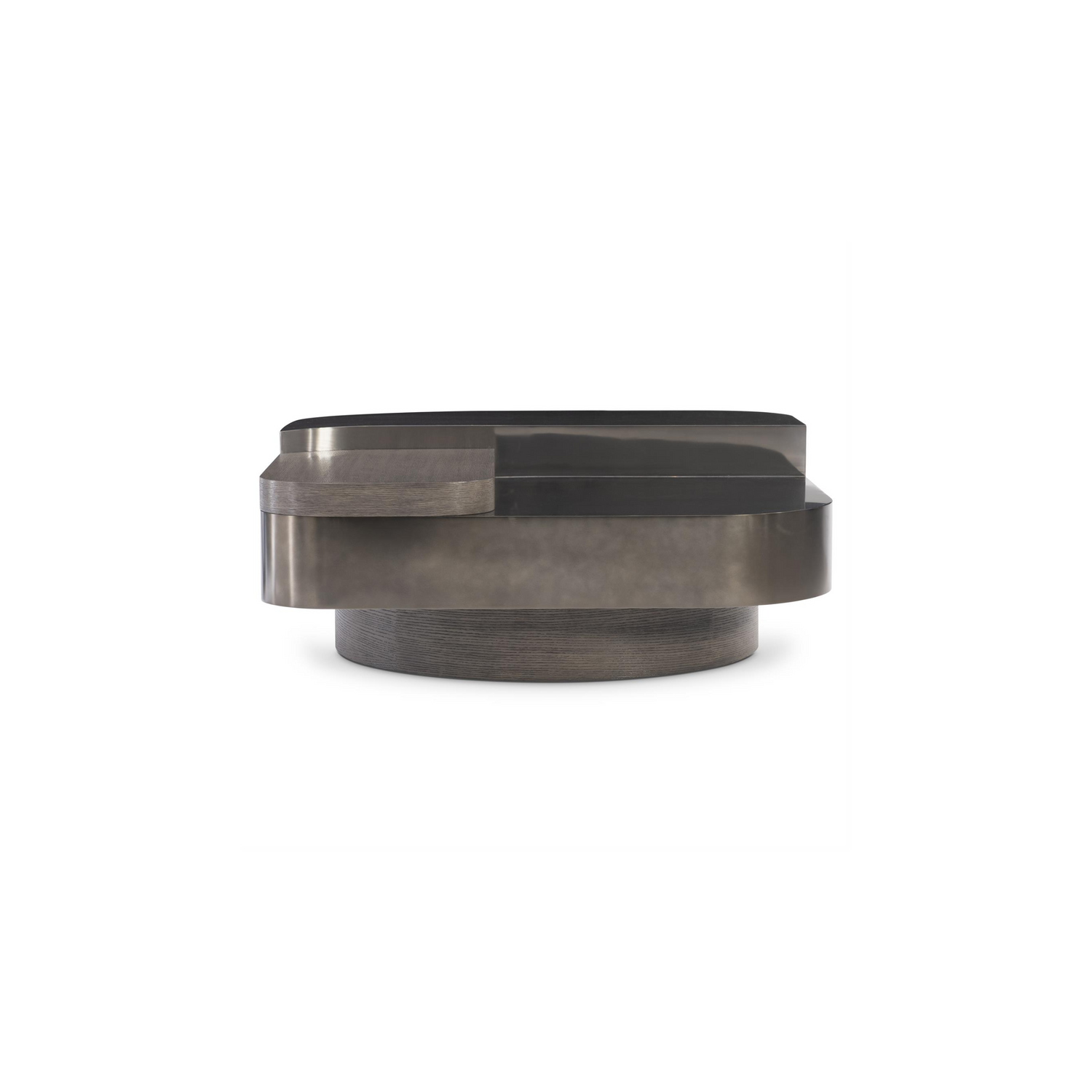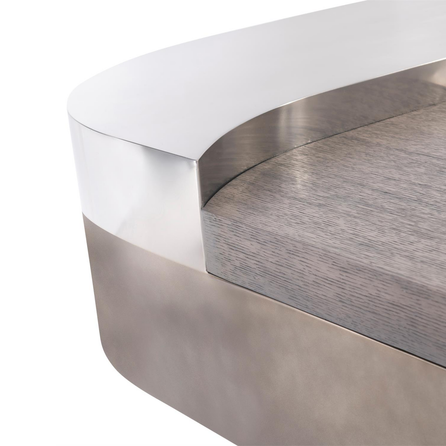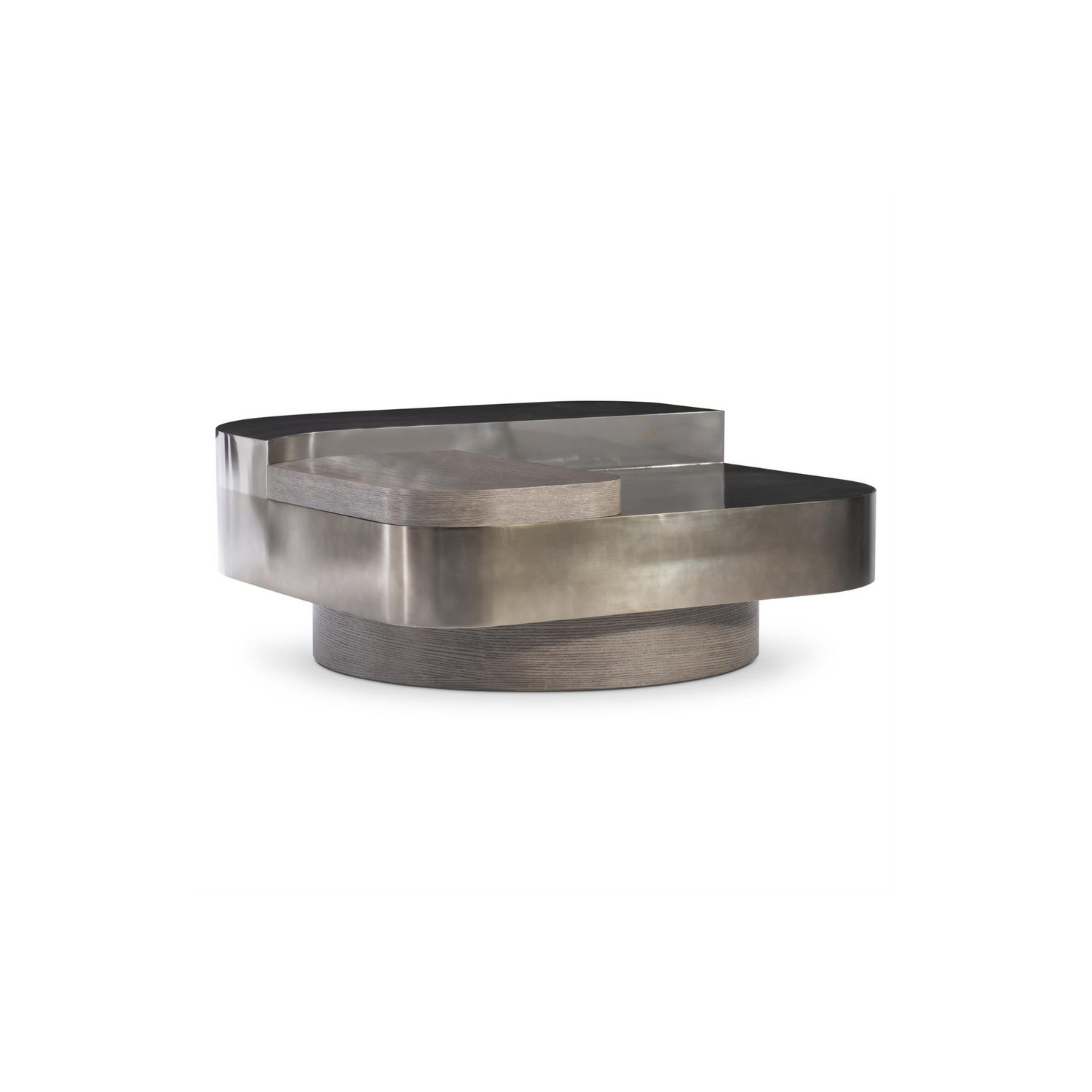 The Jacopo cocktail table offers a stacked and layered modern style, formed with metal and oak. Shapes are curved and flowing, with the stainless steel in both Dark Bronze and Light Bronze finishes. The wire-brushed wood, finished in Kona, offers an inner shelf and a round base.