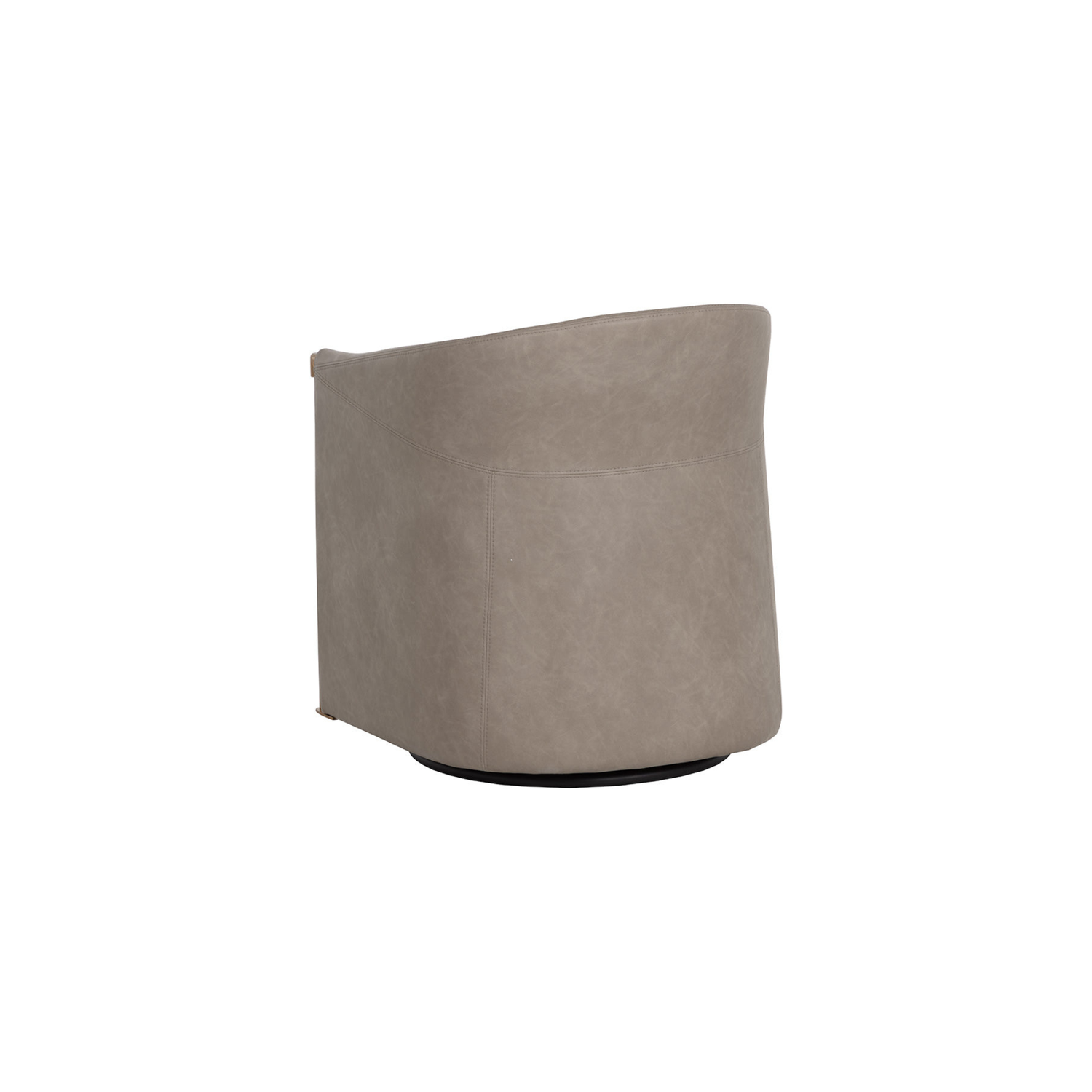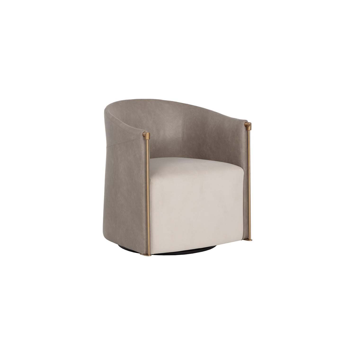 The Leontine Swivel Lounge Chair features a curved barrel-back design upholstered in Ivanhoe mineral faux leather with exposed stitching. A meg taupe fabric seat cushion adds subtle contrast, while slim powder-coated stainless steel arms complete the modern look.