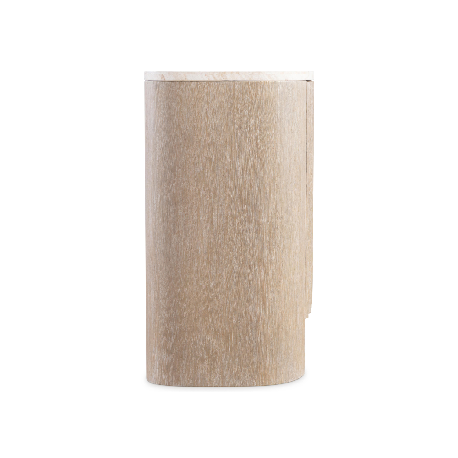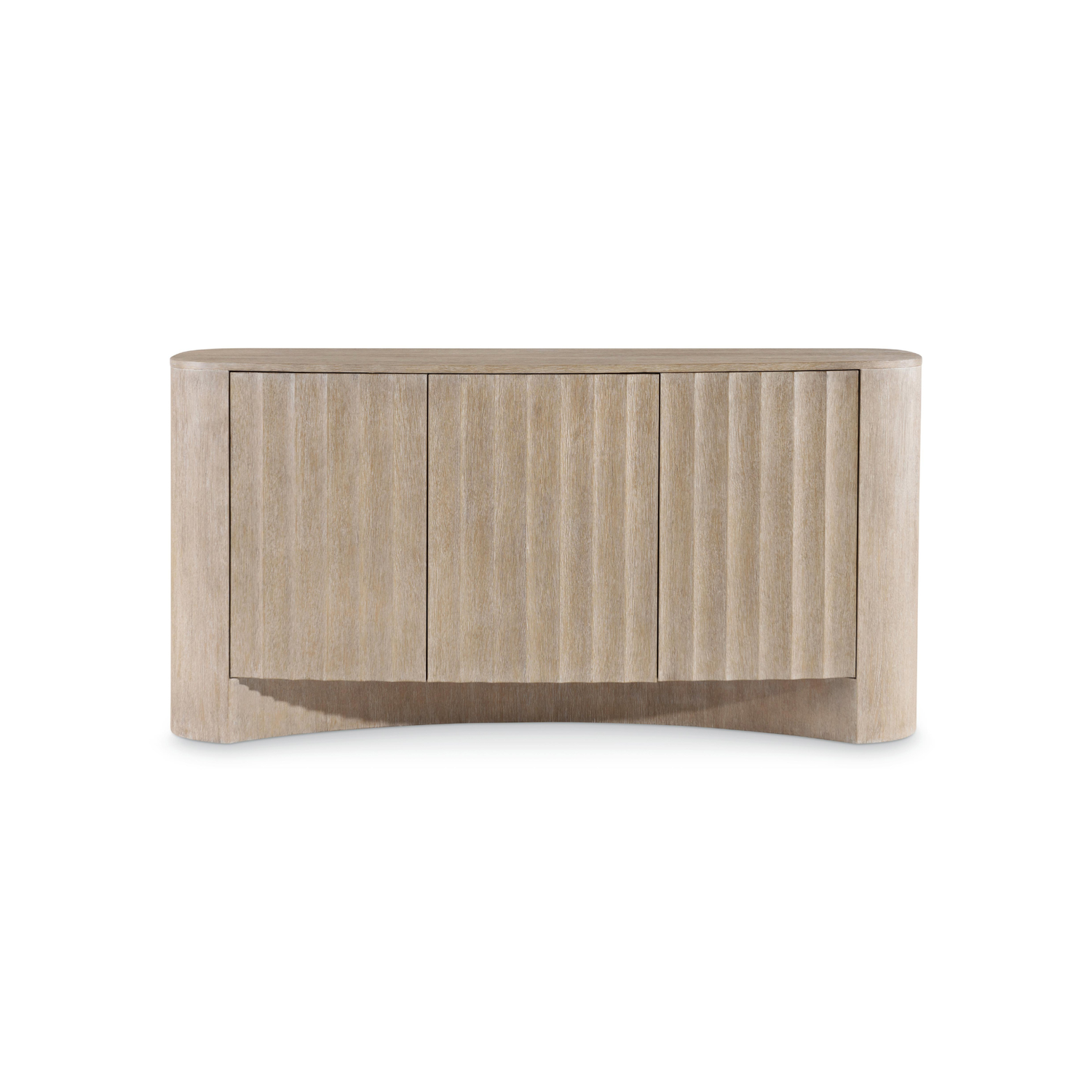 The Loggia buffet patterns contrast and dimension with stunning fluting on its three push-to-open doors. Finished in Aria, the case sits on a shapely concave plinth and supports a travertine stone top with rounded corners. The doors open to reveal adjustable shelves and a center drawer.