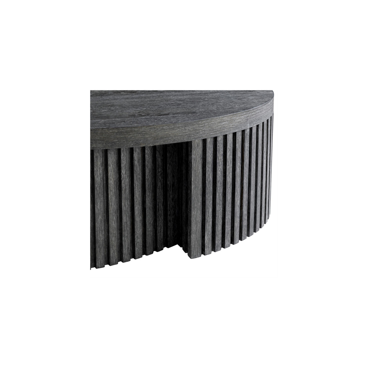A moody, dark finish and architectural inspiration give the Menton cocktail table its distinct design. The base wraps around like a ribbon crafted of linear reeding. It supports an oval top that showcases the woods natural grain through the deep Sutton finish.