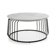 The distinguished Spangle Coffee table has a stunning round grey and white marble top, distinctive iron base with a black finish.