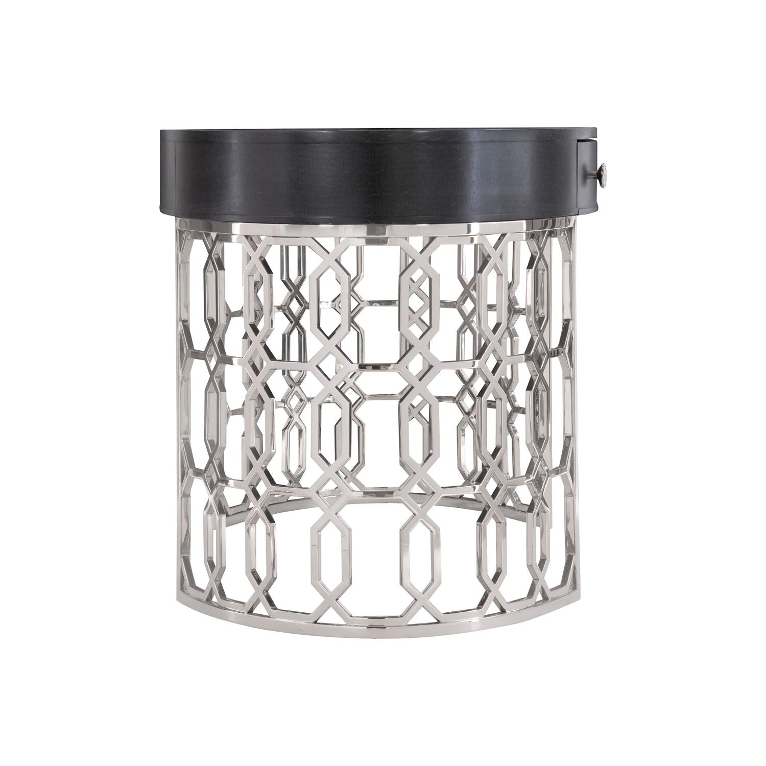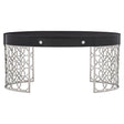 Inspired by Hollywood Regency design, this opulent desk features a dark oval top resting on brilliant stainless steel columns.