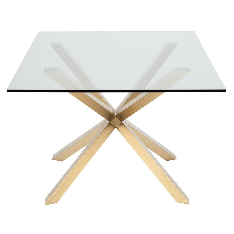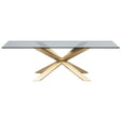 The Couture dining table is an inspired example of bold contemporary design pairing brilliant brushed gold stainless steel with clear tempered glass. The Couture's appeal lies in contrasts, the union of a dynamic steel frame with a sober handsome glass table top, the result striking.