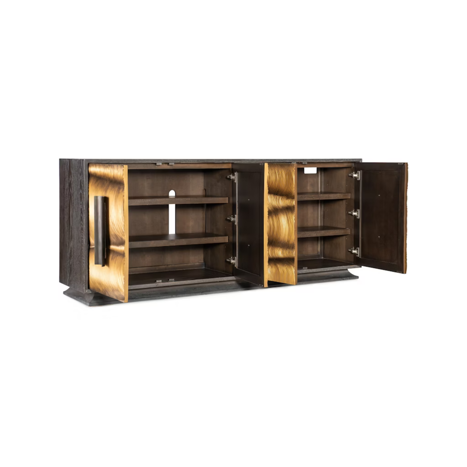 With an earthy and exotic elegance, the Swaley Four-Door Credenza is a striking silhouette with a dramatic gold swirl motif on the front, accented by dramatic curved vertical rectangle-shaped bronze hardware. Crafted of Oak Veneers and Resin, the credenza has 2 adjustable shelves behind each pair of doors, a ventilated back panel with wire management.
