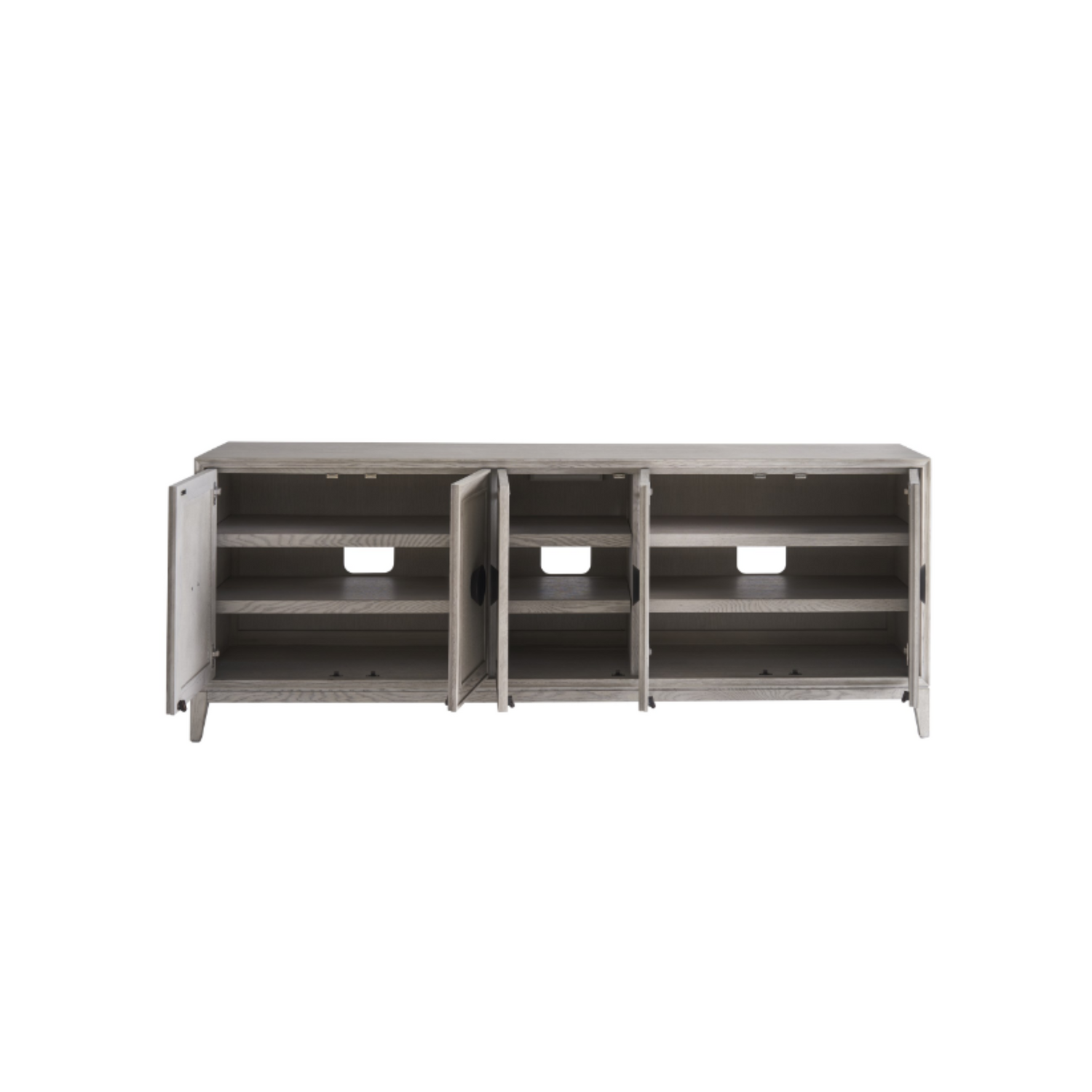 The Coalesce Entertainment Credenza is a confluence of style and utility, boasting generous interior storage complete with four adjustable shelves. Clad in a serene Rolling Fog finish and accented with faux linen texture doors, the piece is defined by circular, slightly oversized metal pulls that lend a trendy, dynamic flourish to this sophisticated organizer.