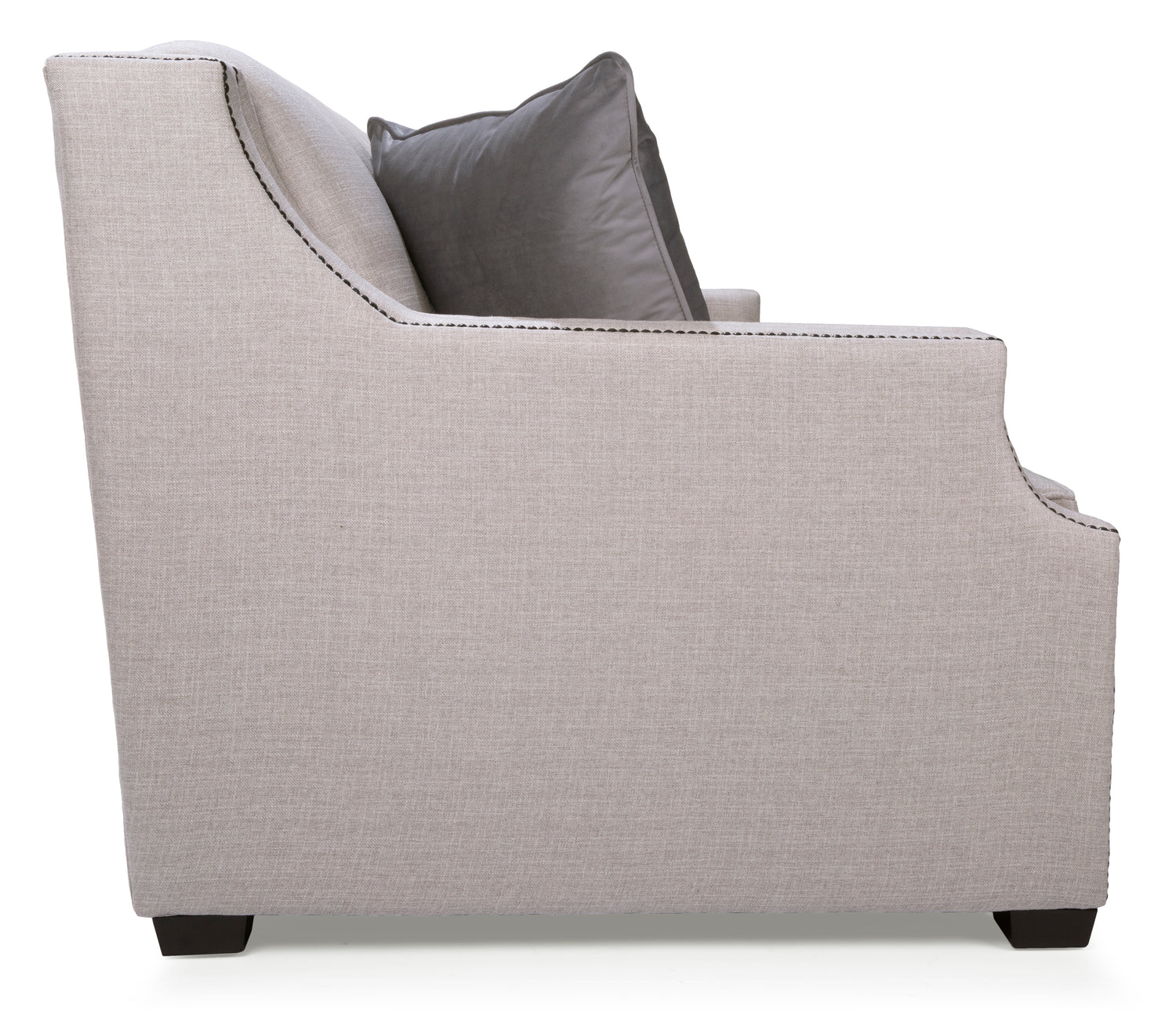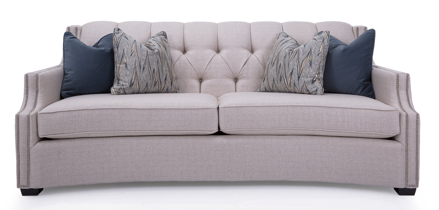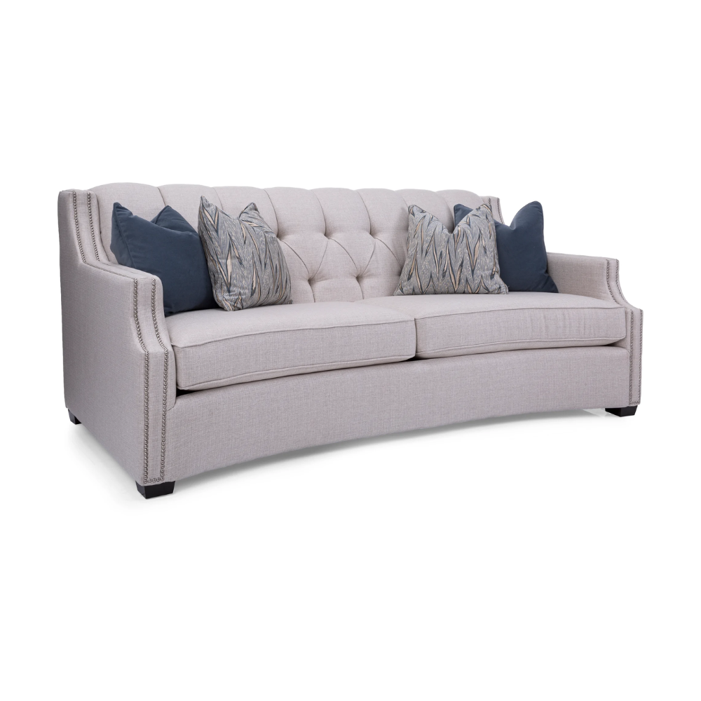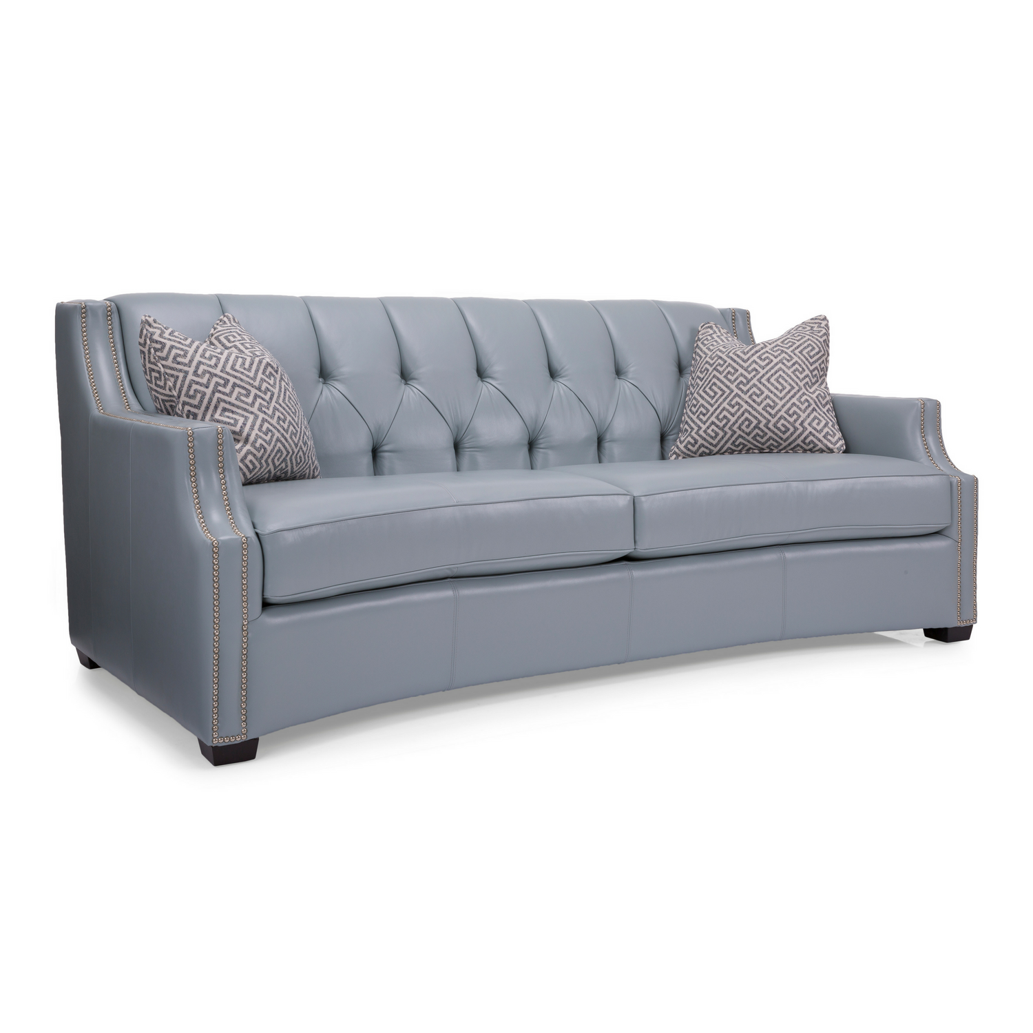 Modern and robust, the Milenia Sofa in Leather has a gorgeous tufted back, box seating with decorative nail studs, a slightly curvy front and espresso wood finish. Made in Canada.