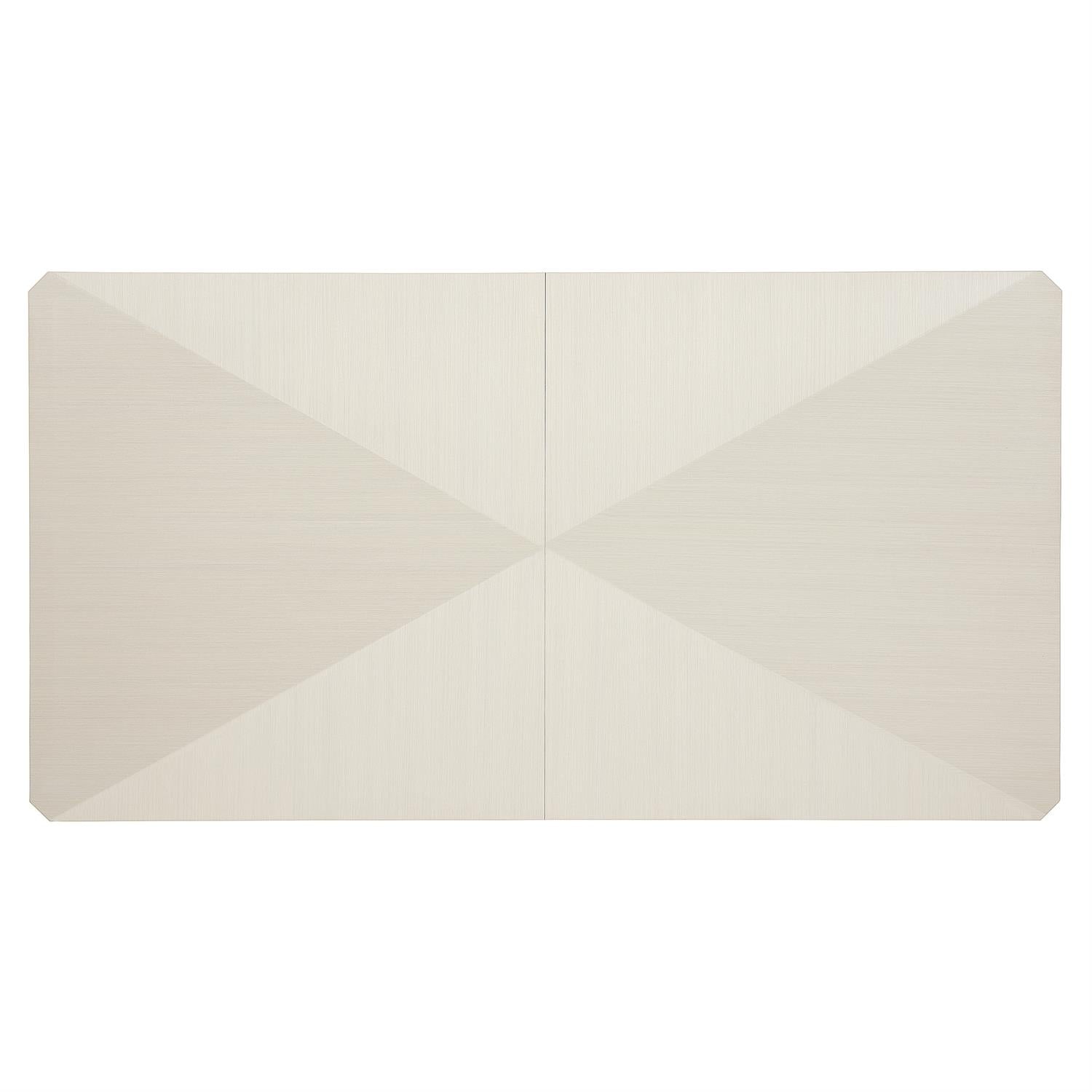 The Axiom dining table uses angular shapes and light, silky finishes to create a distinct style. The tabletop features a fancy face pyramid pattern in Linear White finish. Completing the clean, contemporary look, legs in a Linear Gray finish taper to the floor. Two 20" leaves create room for larger parties.