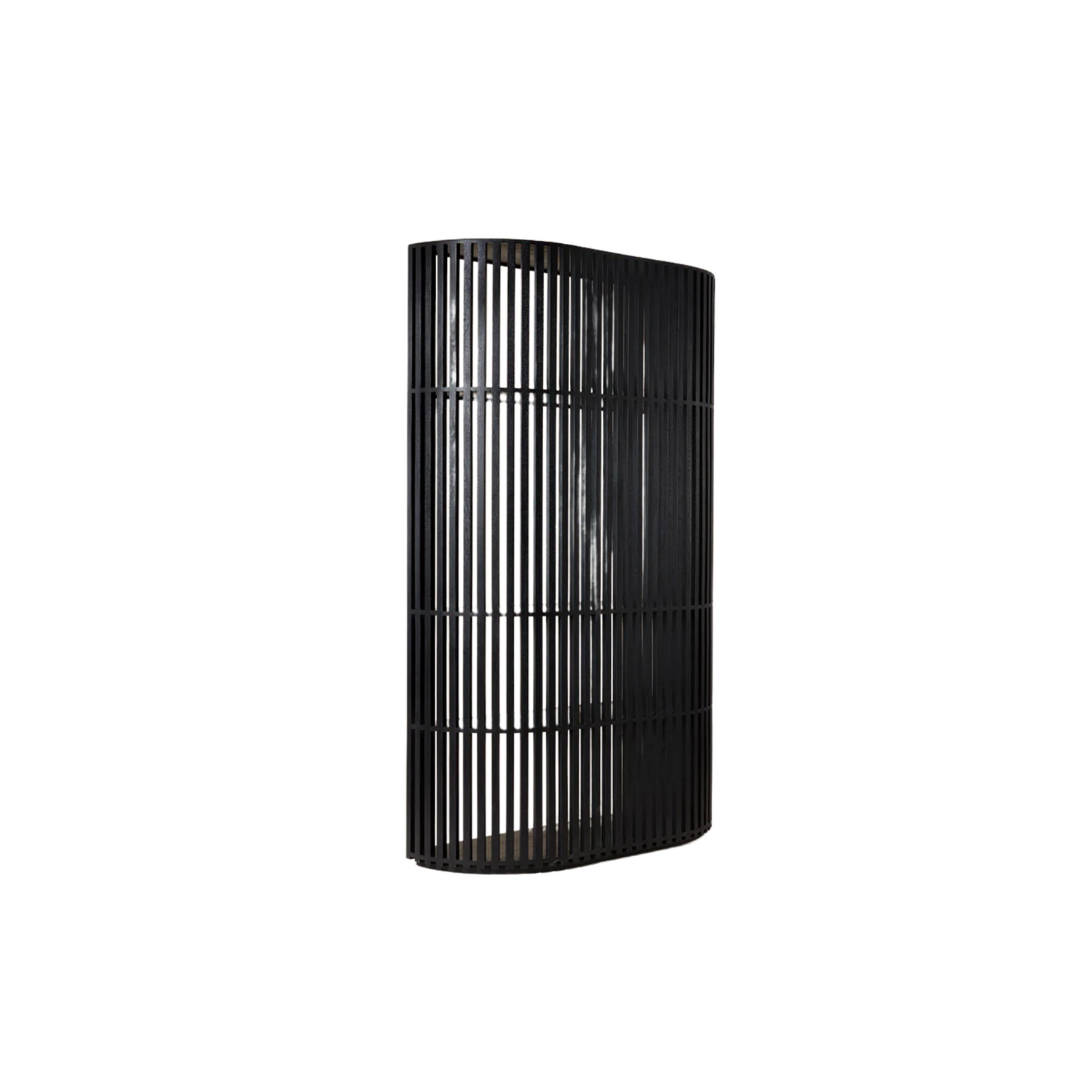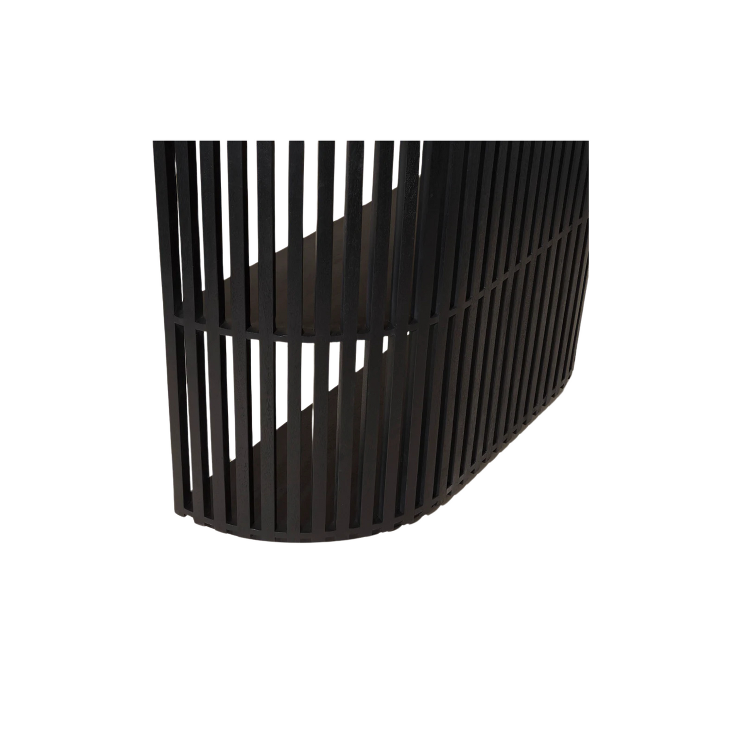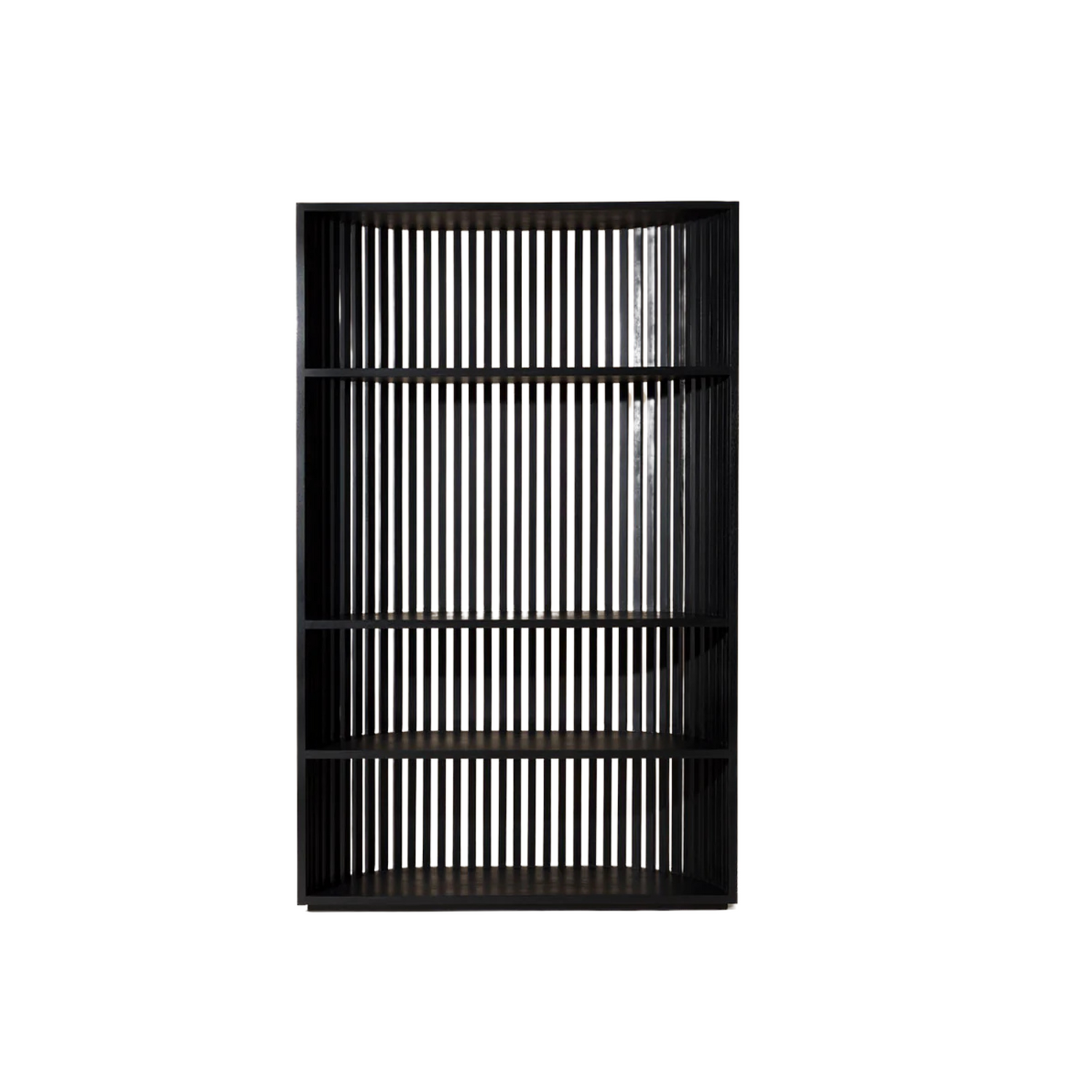 This modern bookcase features a curved black mango wood frame, showcasing the natural beauty of the wood with unique imperfections like fissures and knots. Crafted by skilled artisans in India, it includes an anti-tip kit for safety. Its substantial size and versatile shelving make it a functional and artistic addition to any space.